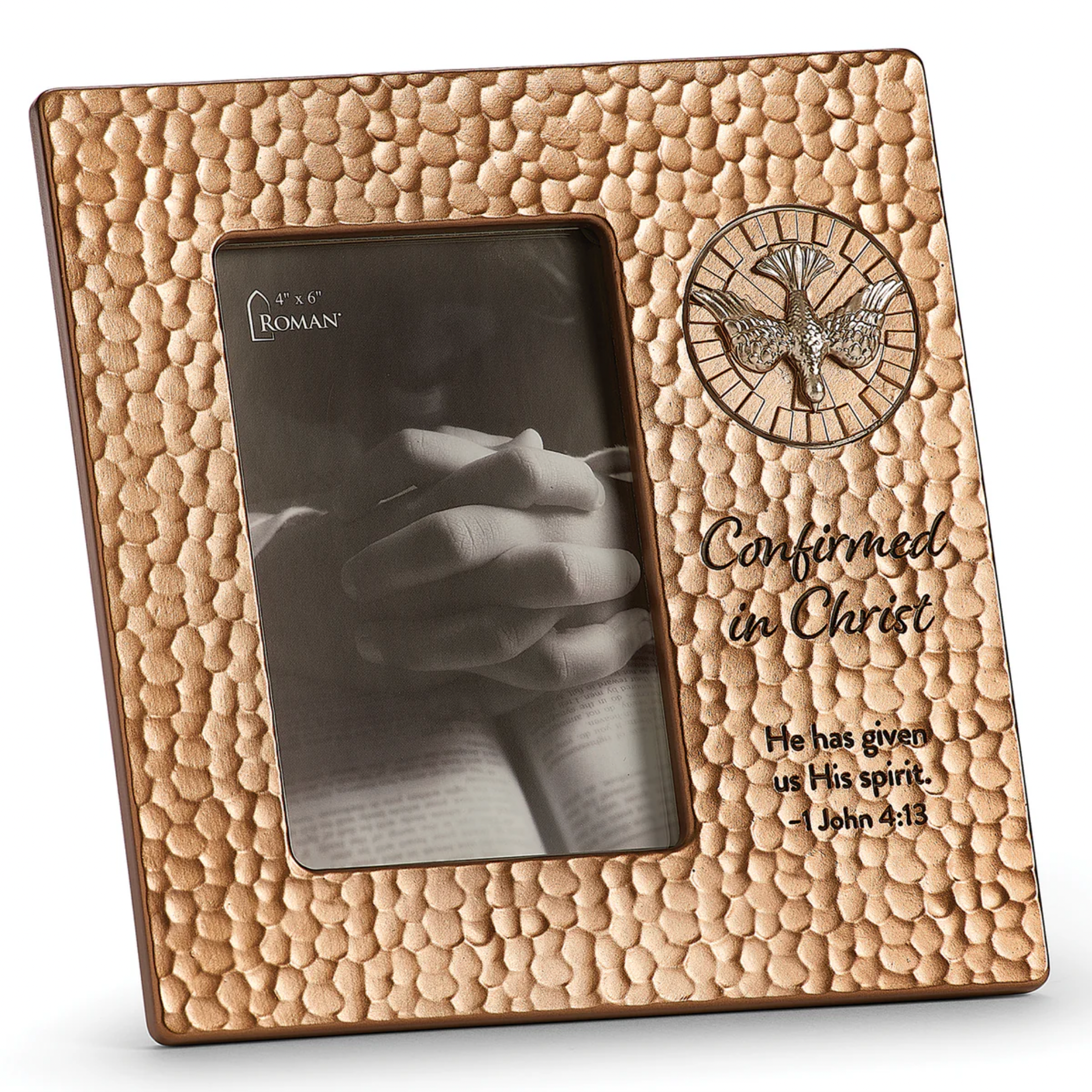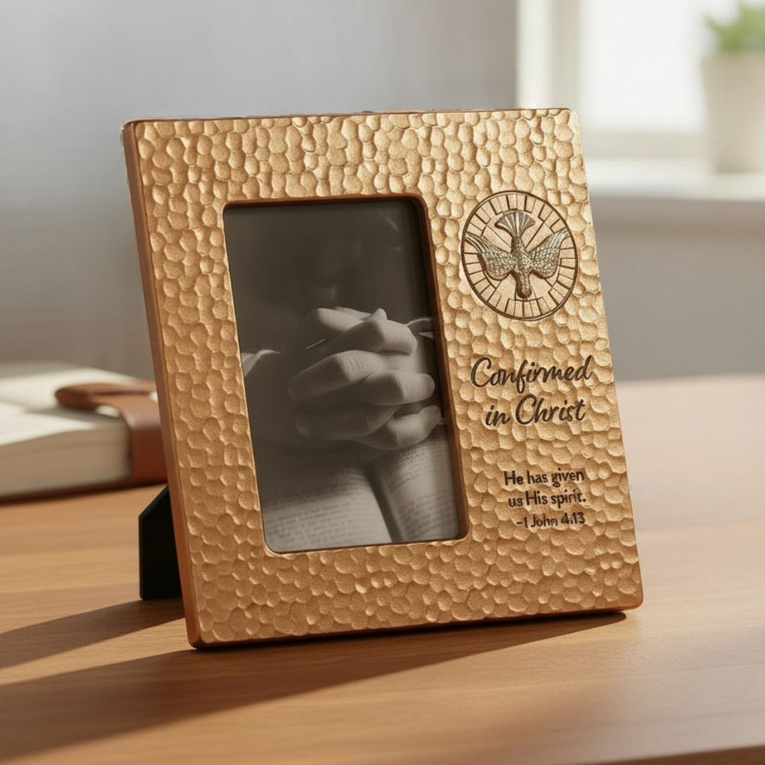 This elegant Confirmation frame is designed to preserve precious memories of one of the most important sacraments in a young person's faith journey. Crafted by Roman with reverent attention to detail, this premium 9.25" keepsake transforms a cherished 4x6 photograph into a lasting memento of this holy occasion. The timeless design and quality construction make it a meaningful way to honor the sacred commitment made during the Sacrament of Confirmation.