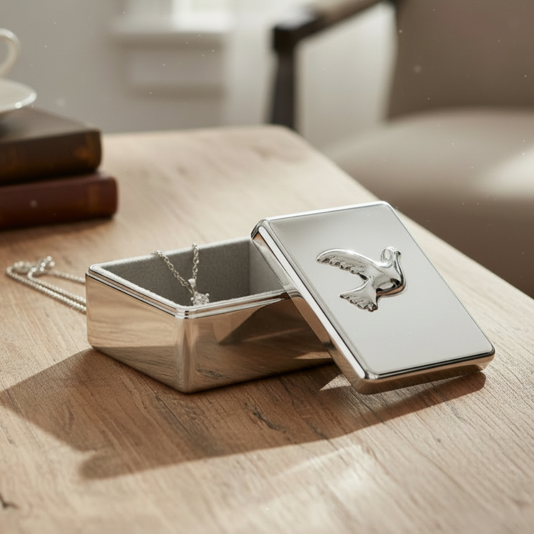 - Design: Holy Spirit dove emblem on lid