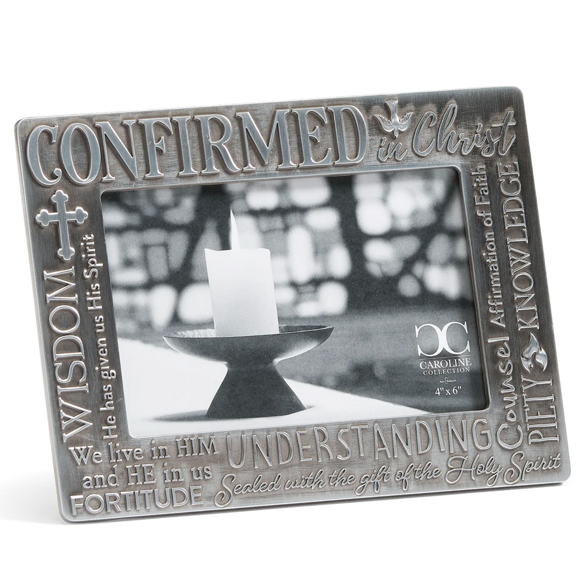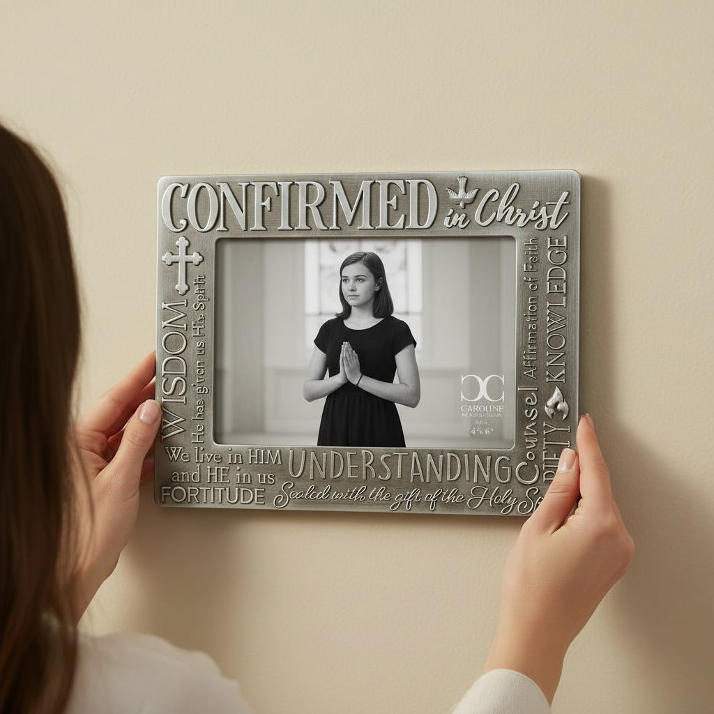 Celebrate the sacred sacrament of Confirmation with this elegant silver-finish word frame from the Caroline Collection. Adorned with inspiring sacramental words, this beautifully crafted keepsake transforms a cherished 4x6 photograph into a lasting reminder of faith, grace, and the Holy Spirit's gifts. The reverent design and quality construction make this frame a treasured addition to any home, creating a daily touchpoint for reflection and prayer.