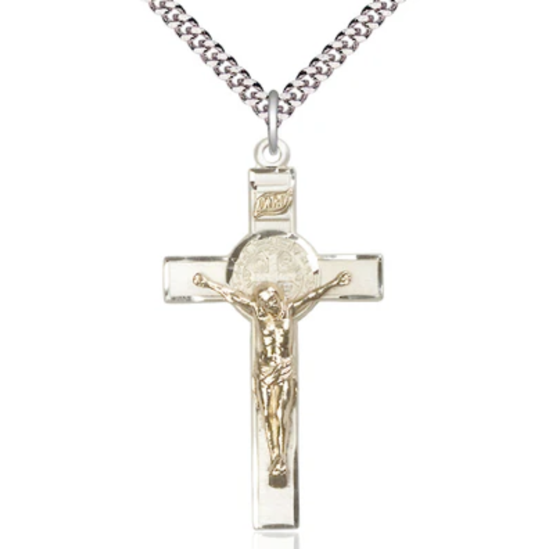 GF/SS St Benedict Crucifix Pendant on a 24 inch Light Rhodium Heavy Curb Chain.