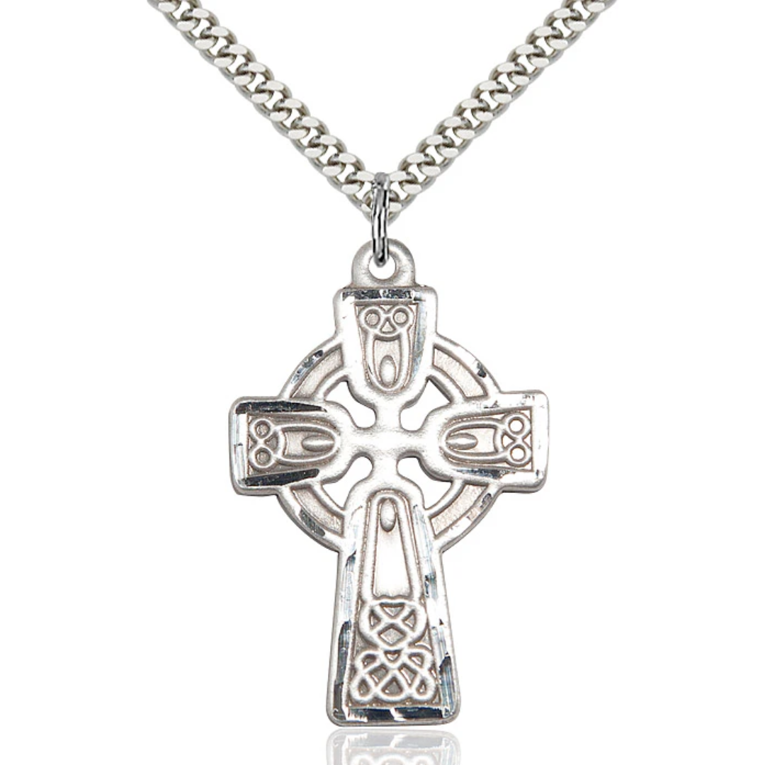1 3/8 x 7/8 Sterling Silver Celtic Cross Pendant on a 24 Inch Light Rhodium Heavy Curb Chain