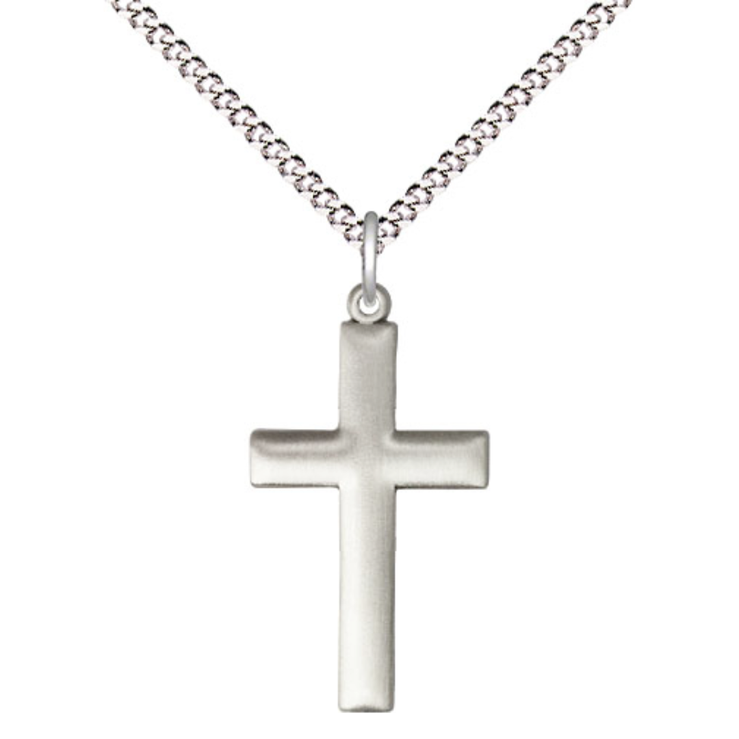 Cross Medal.Medal Measures 7/8-inch tall by 1/2 - inch wide.Chain is 18 Inches in length Light Rhodium Light Curb Chain with Lobster Claw Clasp.
