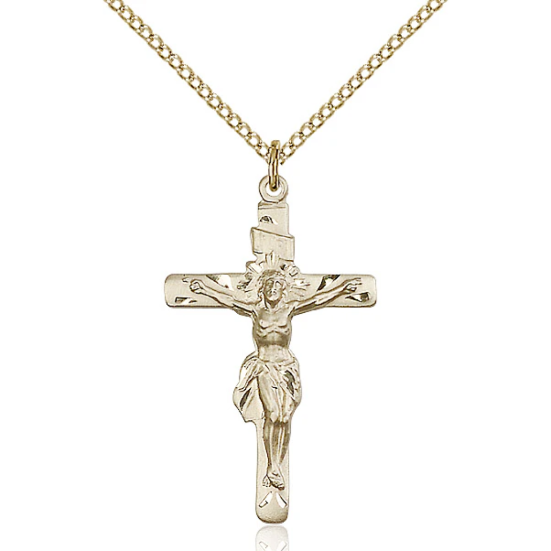 1 1/4 x 3/4 14kt Gold Filled Crucifix Pendant on a 18 inch Gold Filled Light Curb Chain