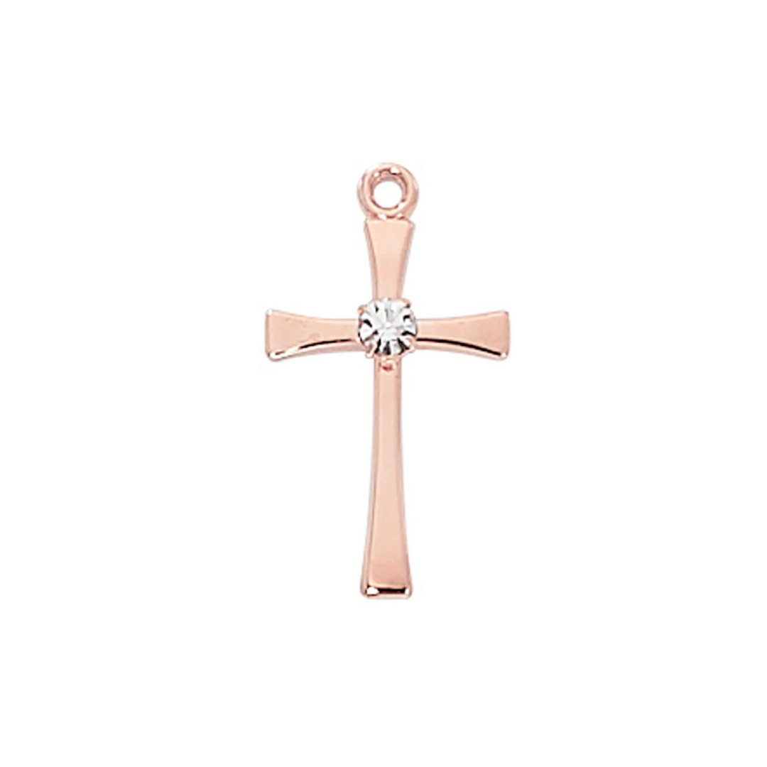 Rose gold over sterling cross with crystal with 18" rhodium plated brass chain boxed
