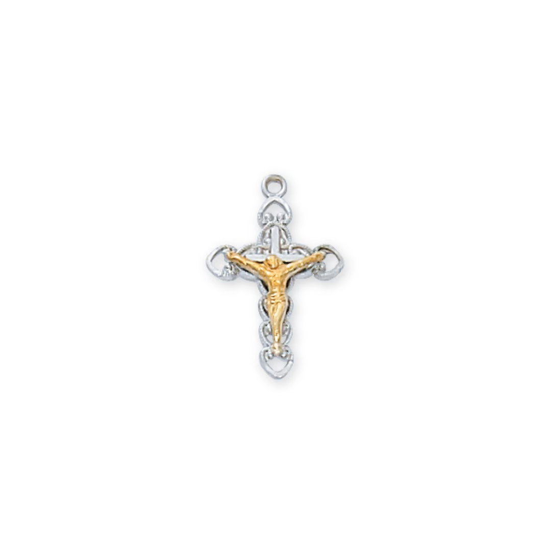 Sterling silver and gold plated two-tone crucifix necklace with a rhodium plated 16 inch chain