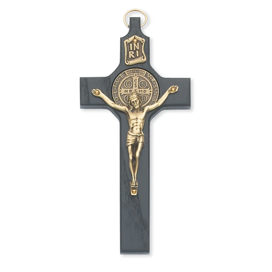 Black wood St. Benedict crucifix with gold colored crucifix and benedictine medal