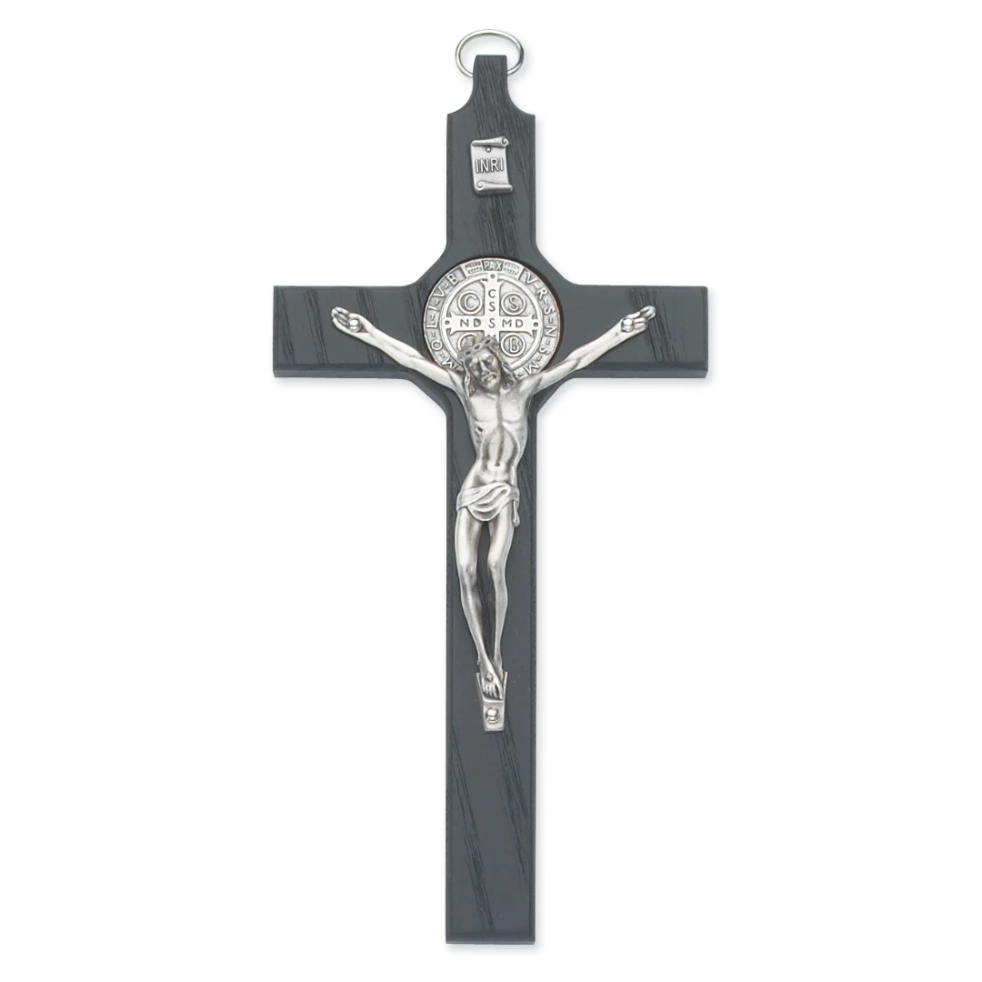 Black wood St. Benedict crucifix with silver oxidized corpus and benedictine medal