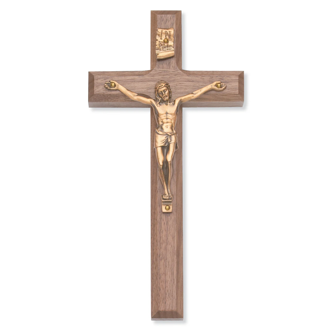 Beveled Walnut Stain Crucifix Gold Corpus