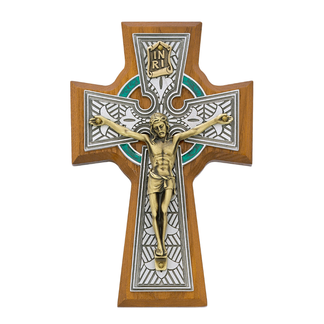 Walnut stained ash wood crucifix with pewter Celtic corpus