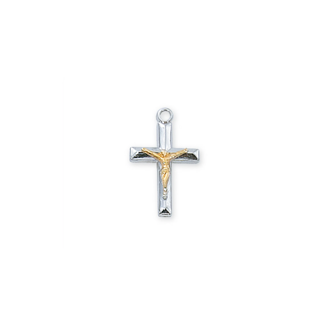 Sterling silver and gold plated two-tone crucifix necklace with a rhodium plated 18 inch chain