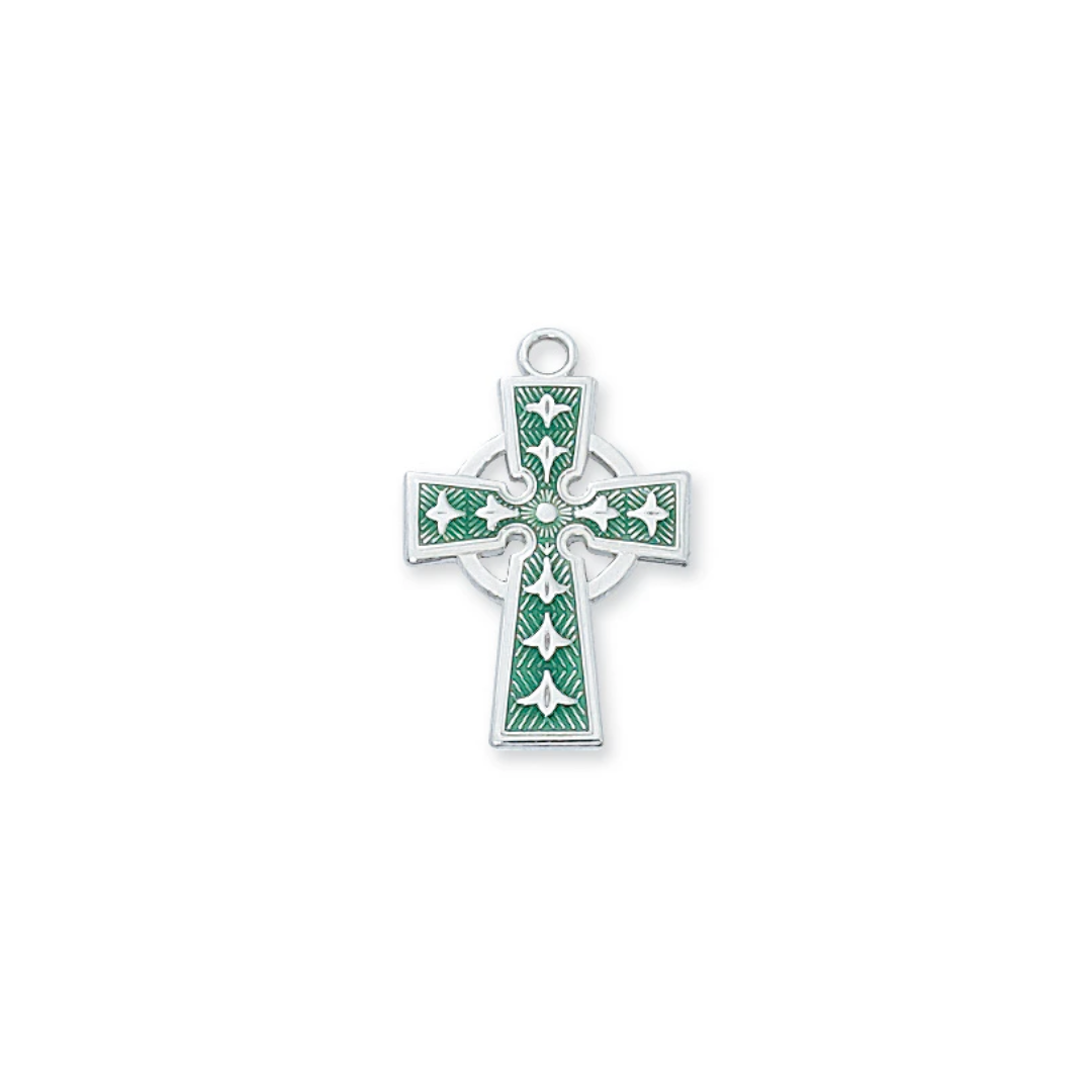 Sterling silver Celtic cross necklace with green coloring, on a rhodium plated 18 inch chain