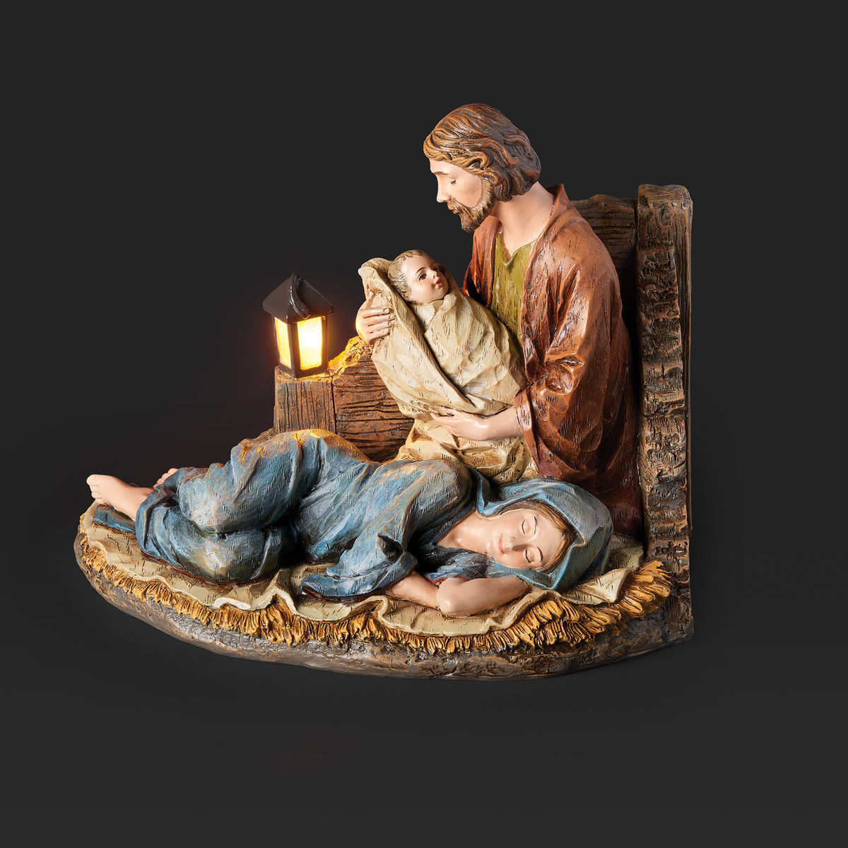 From the Joseph™s Studio Collection, this Holy Family figure captures a quiet, tender moment of the Nativity. Mary rests peacefully as Joseph gently holds the newborn Jesus, illuminated by a softly glowing lantern. A touching reminder of divine love and care, this lighted piece brings warmth and serenity to any holiday display.