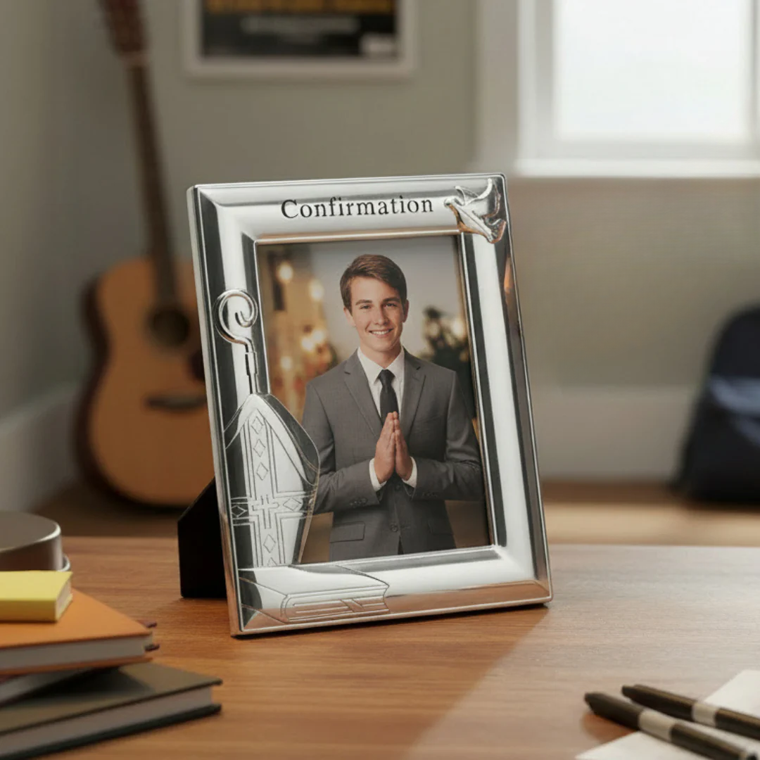 Celebrate the sacred milestone of Confirmation with this exquisite silver-toned picture frame from Roman's beloved Caroline Collection. Featuring an elegant bishop mitre and crosier design, and a dove, the symbol of the Holy Spirit, this frame transforms a cherished Confirmation photograph into a lasting keepsake of faith. The refined metallic finish and reverent iconography make it a gift-ready treasure that honors the solemnity and joy of this important sacrament.