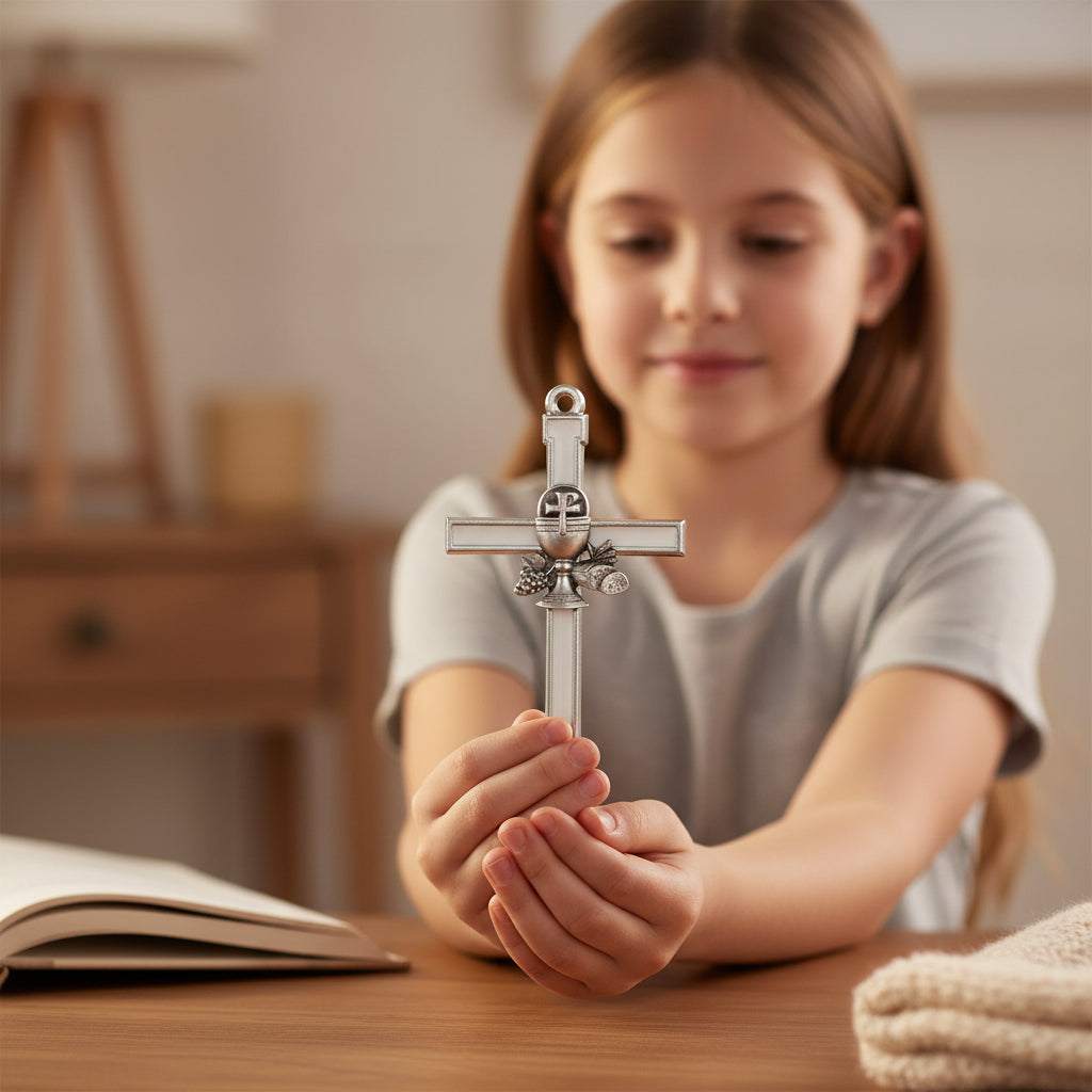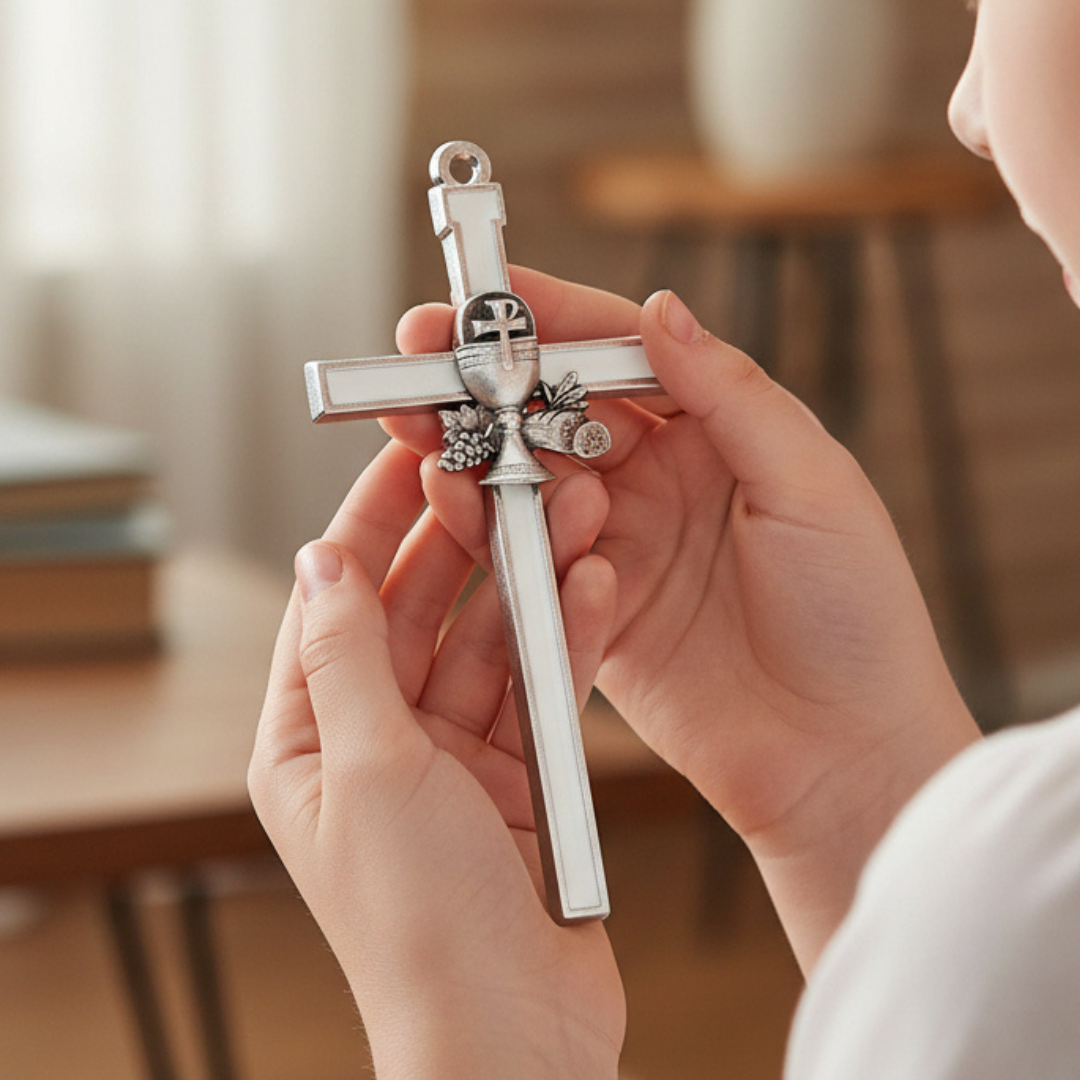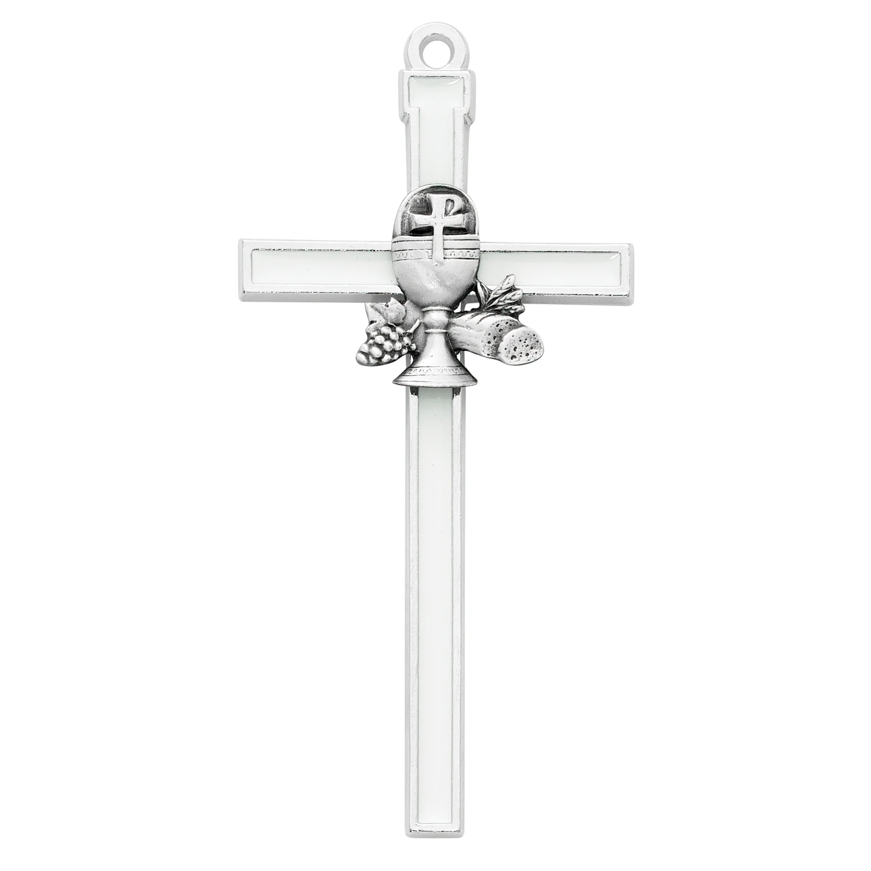 Celebrate this sacred milestone with our beautifully crafted 5" white enameled First Communion cross featuring an elegant pewter chalice, proudly made in the USA by McVan.