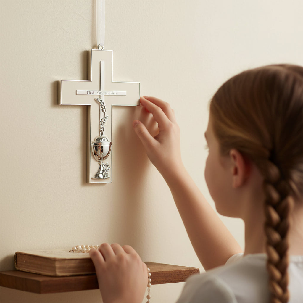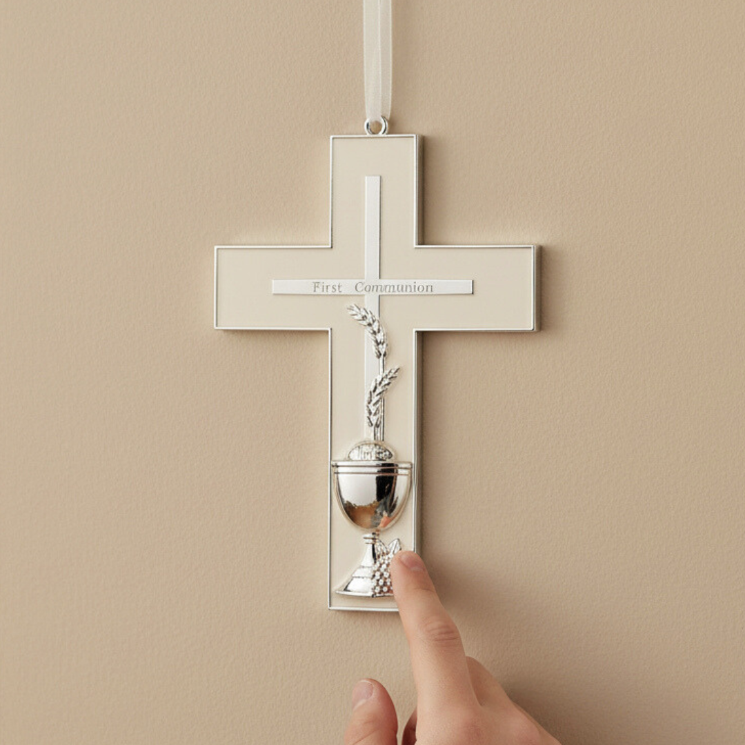 This elegant First Communion wall cross from the Caroline Collection beautifully commemorates one of the most sacred milestones in a child's faith journey. Measuring 7 inches in height, the cross features intricate silver-toned chalice and wheat symbols, timeless emblems of the Holy Eucharist. Crafted with reverent attention to detail, this keepsake serves as both a meaningful gift and a lasting reminder of this blessed sacrament, perfect for display in a child's room or prayer space.