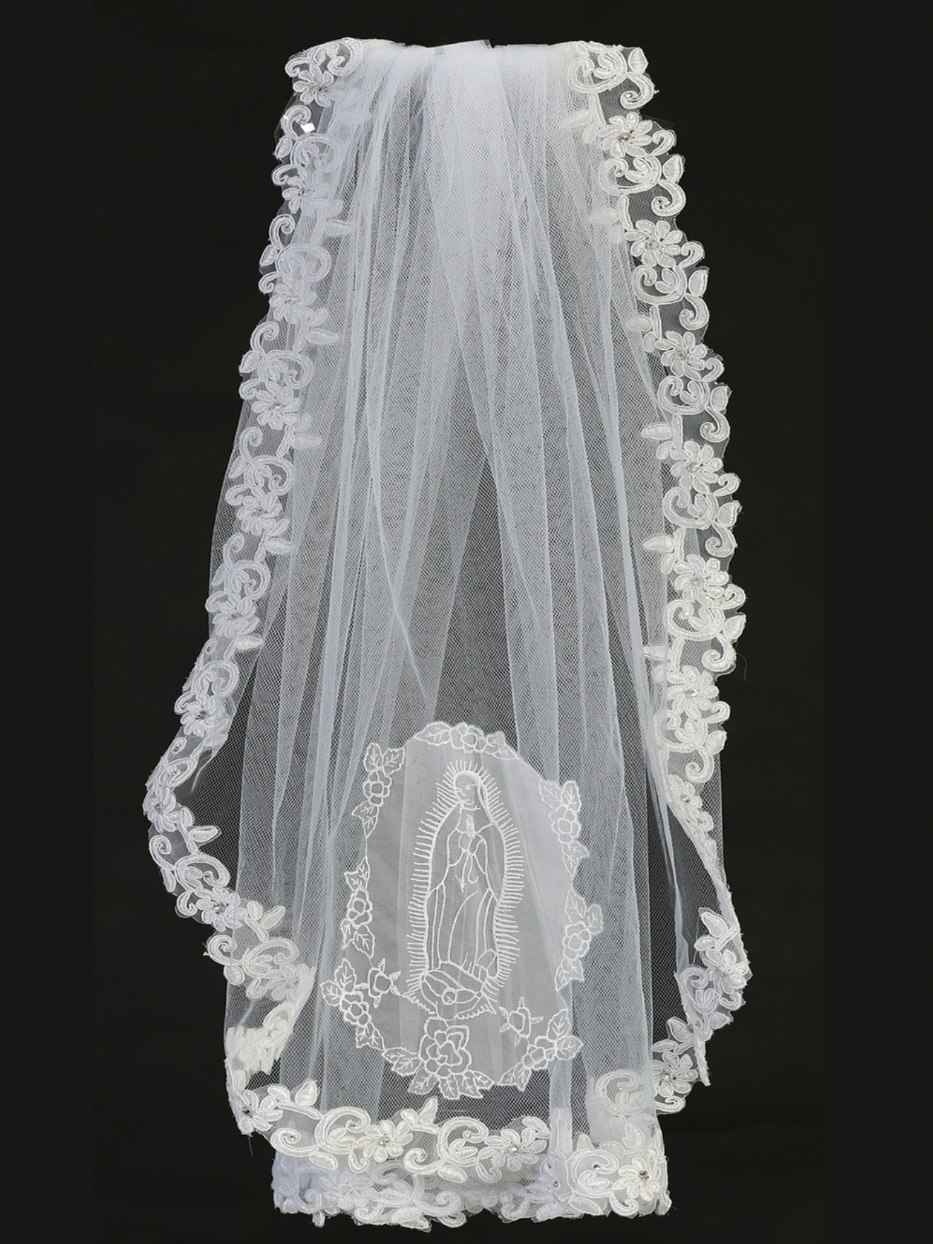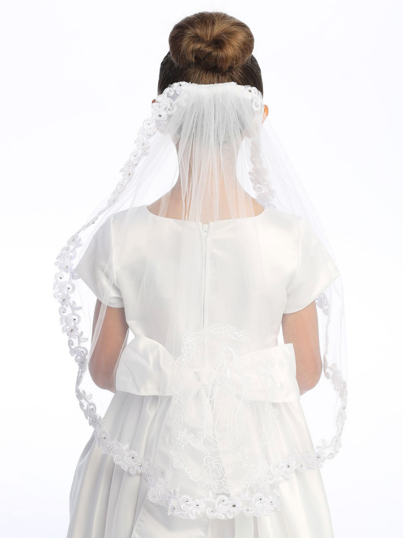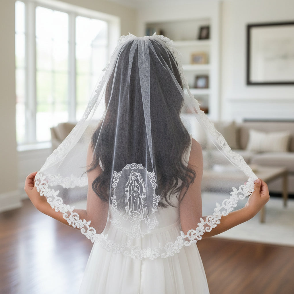 Make her First Holy Communion even more sacred with this exquisite 24-inch white veil featuring a beautiful image of Our Lady of Guadalupe. Crafted by Lito with meticulous attention to detail, this elegant communion veil combines traditional reverence with timeless beauty. The delicate corded lace trim frames her face with grace, while the beloved image of Our Lady of Guadalupe on the back serves as a gentle reminder of Mary's loving protection on this special sacramental day.