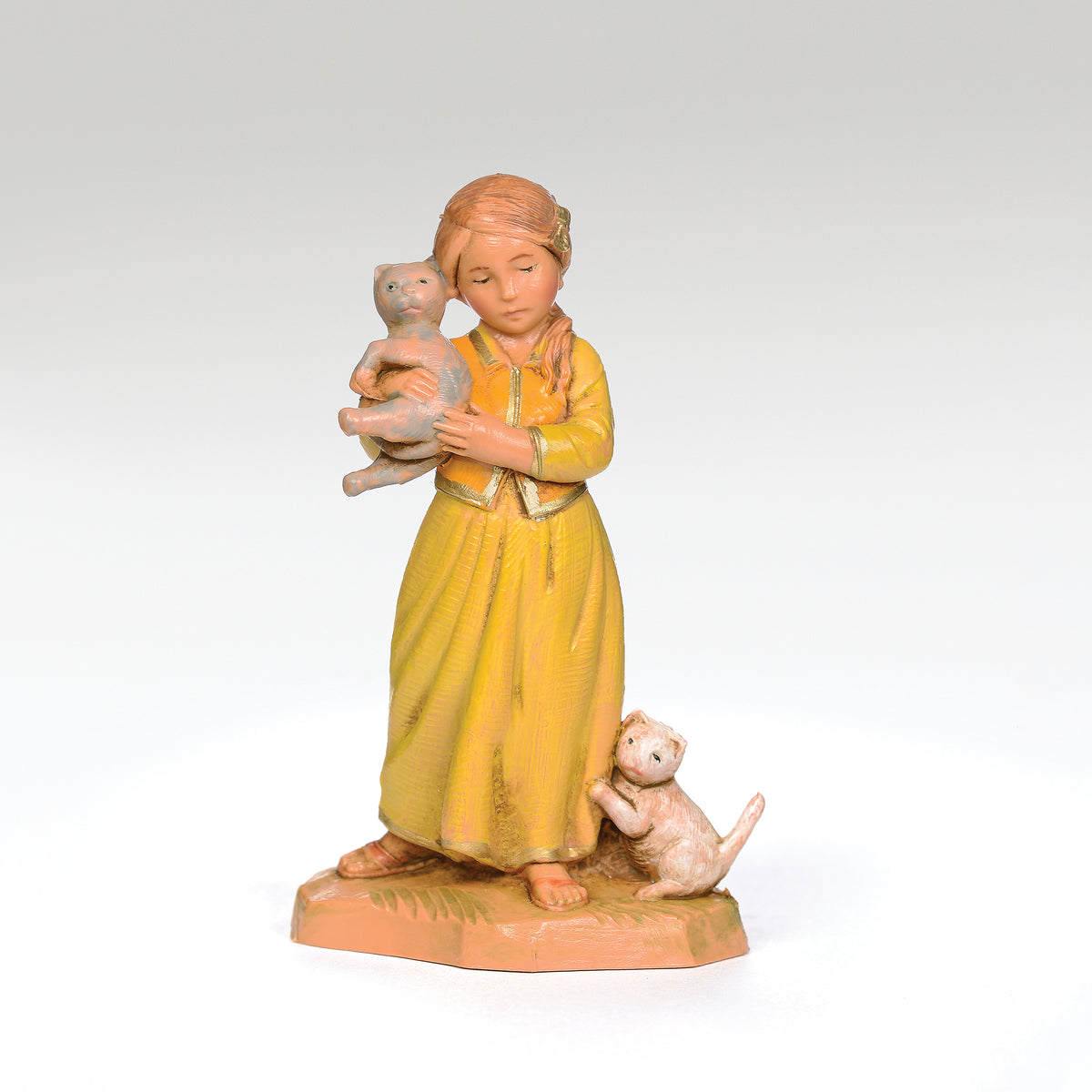 Filia shows a young girl holding her cat Shalom, while another kitten plays at her feet. She is dressed in warm harvest tones, her expression sculpted with lifelike detail. Guided by the instincts of her cat, Filia™s story tells of a simple encounter on the road to Bethlehem, where her kindness offered help to a weary couple. This figure brings a personal touch to the Nativity, reminding us how even the smallest gestures can carry lasting meaning.