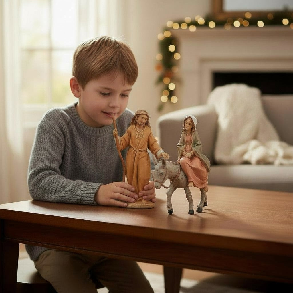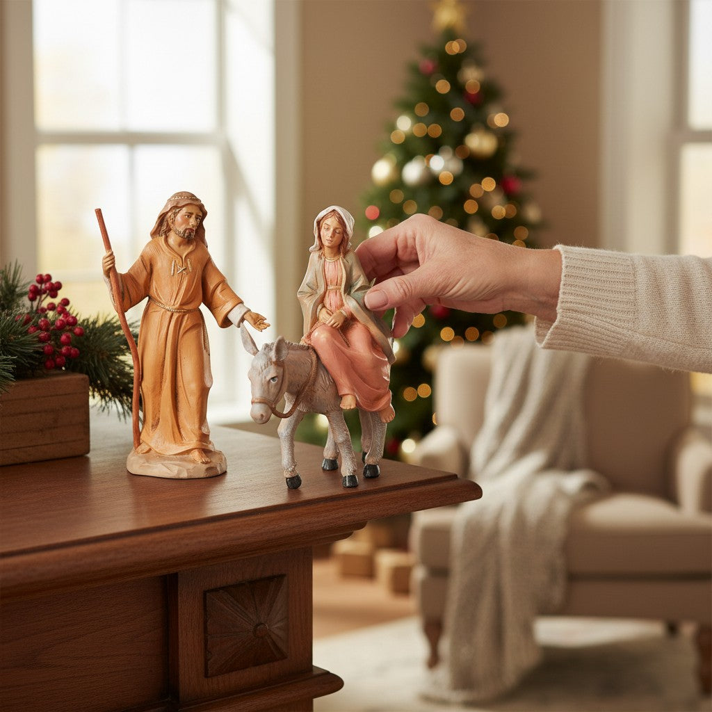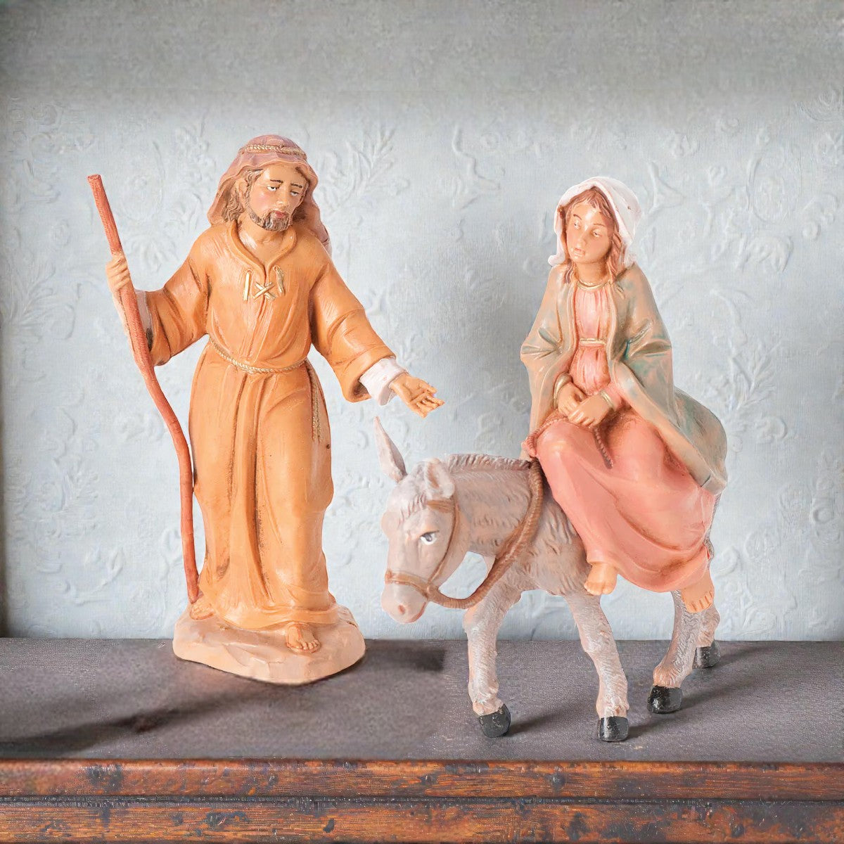 This 2-PC set depicts the holy couple on their way to Bethlehem, where the Savior would soon be born. Mary rides side-saddle on a humble donkey, her rose robes covered by a pale green mantle, while Joseph walks with staff in hand, guiding them forward in faith. Part of the Life of Christ Collection, it captures the anticipation of Christ™s birth and adds lasting meaning to any Nativity display.