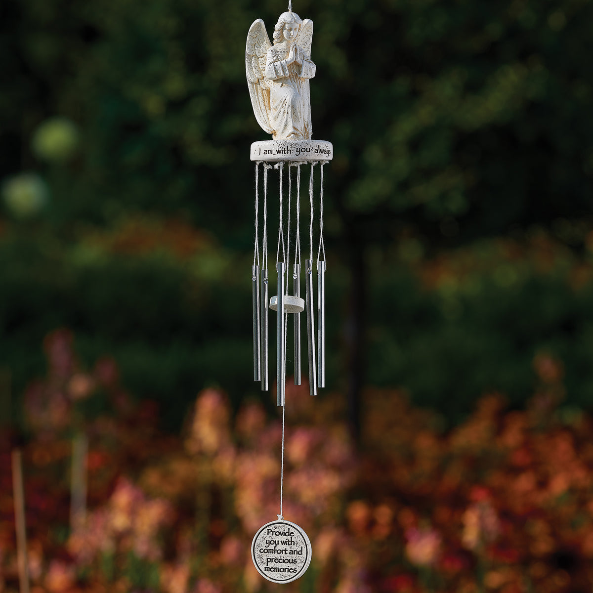This Praying Angel Wind chime brings gentle sound and heartfelt sentiment to your space. Featuring a beautifully sculpted angel and meaningful inscriptions: