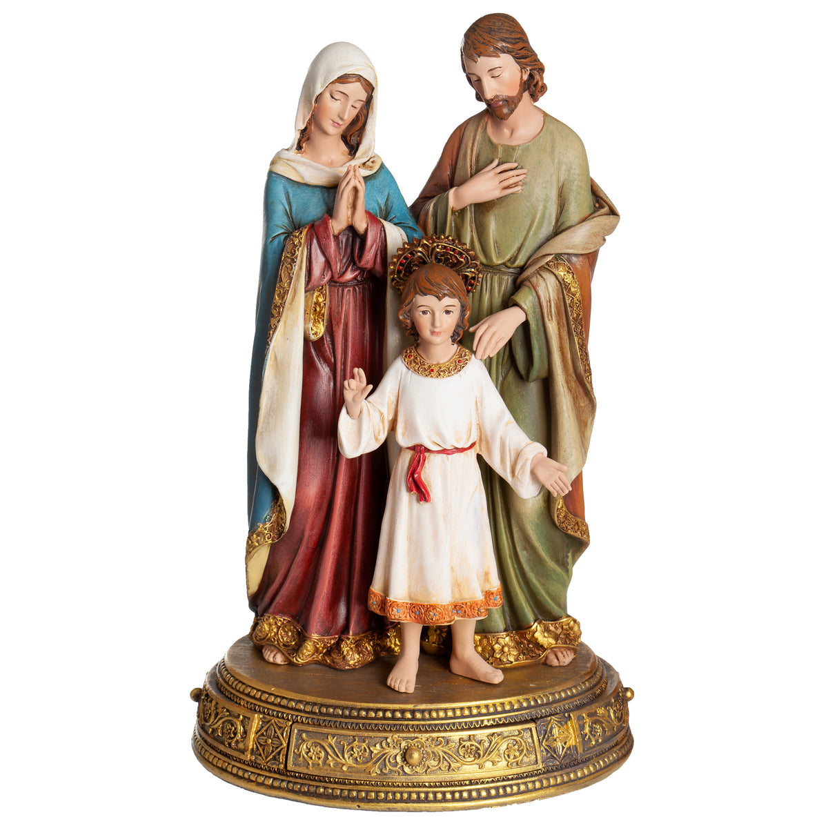 This Renaissance-style Holy Family figure captures the love and serenity of Mary, Joseph, and the Child Jesus in a beautifully detailed design. Expertly crafted from high-quality resin and finished with rich hand-painted colors, the statue rests on an ornate base that adds to its reverent charm. The decorative base includes a hidden drawer containing a scroll inscribed with the prayer: "Jesus, Mary, and Joseph, I give you my heart. Jesus, Mary, and Joseph, be with me in my last hour..." Perfect for holiday décor, year-round devotion, or as a meaningful gift, this timeless statue is a treasured expression of faith, family, and tradition.