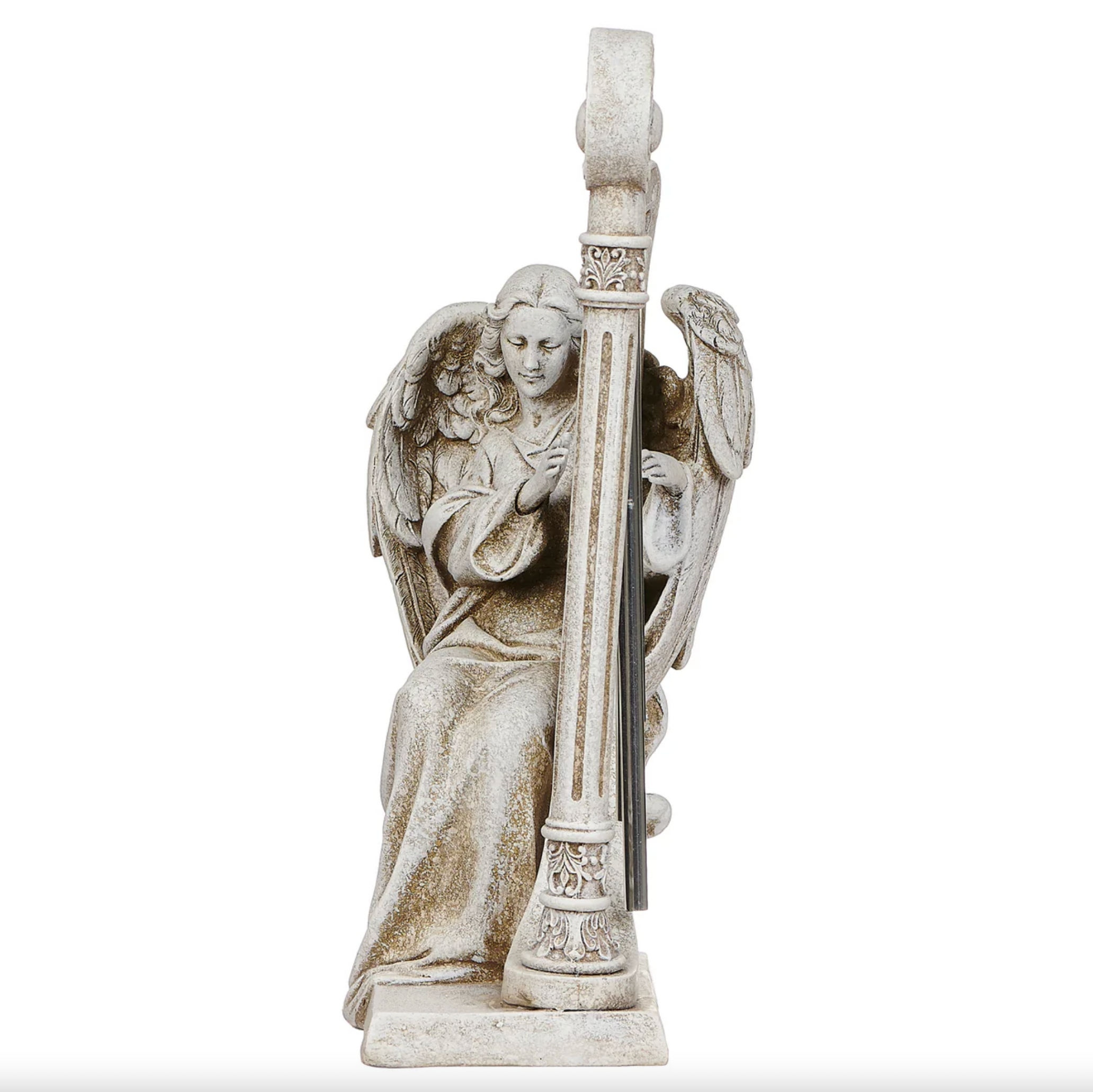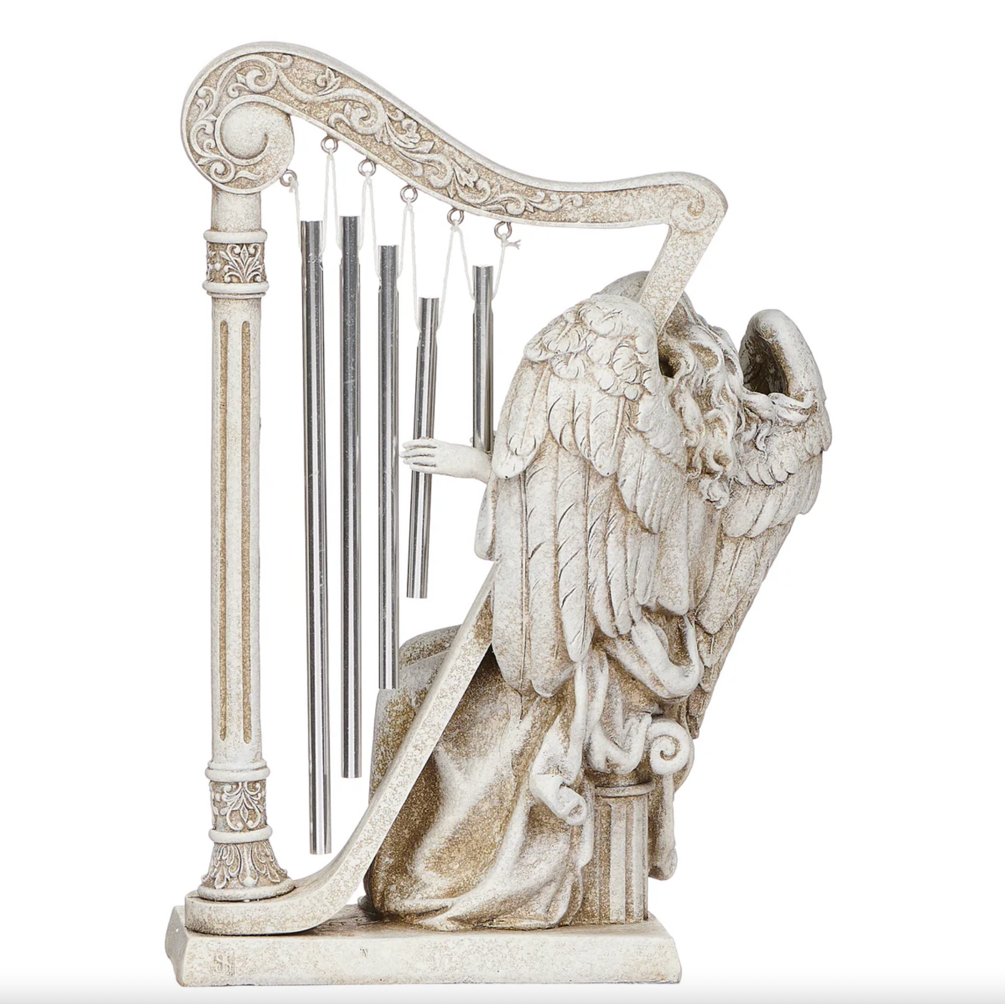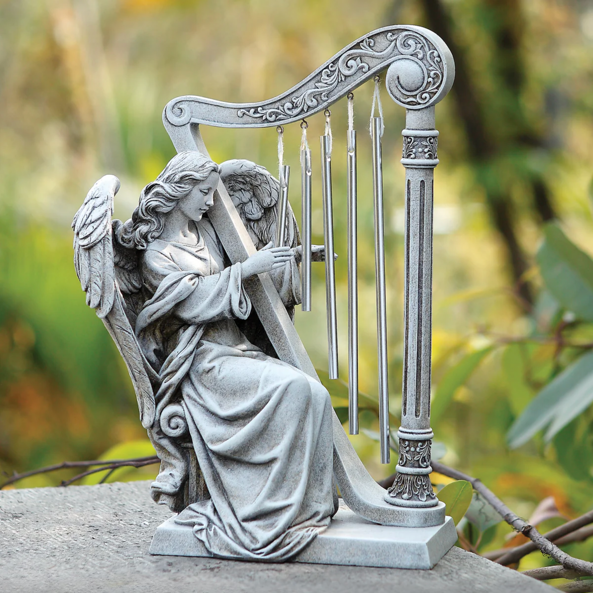 Let peace settle into your space with the heavenly charm of our Seraphic Angel Garden Statue. Gracefully seated and gently strumming a harp of windchimes, this angel radiates serenity and celestial music with every breeze. Her tranquil expression and flowing robes evoke timeless grace, making her a beautiful addition to any garden, patio, or sacred outdoor space. Crafted with meticulous attention to detail, this statue captures the essence of divine harmony and brings a touch of heaven to your home.