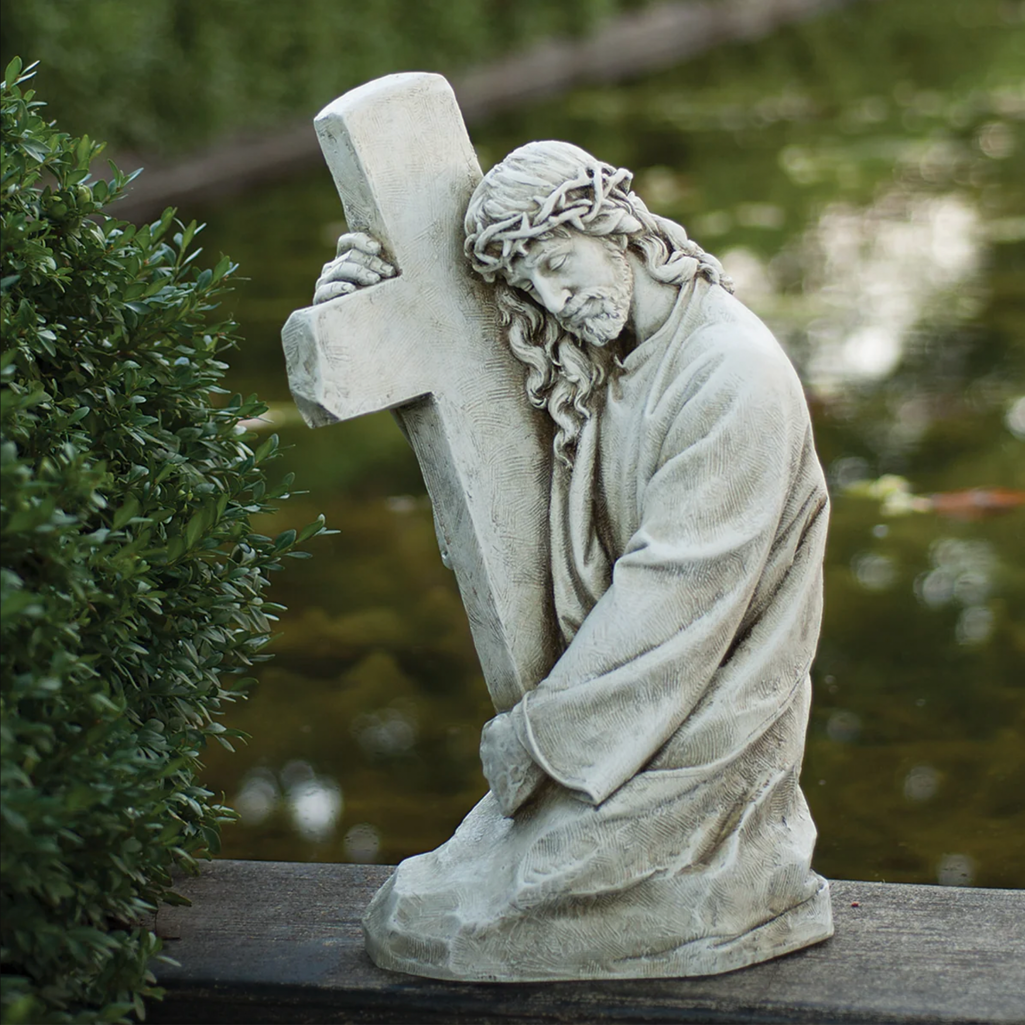 This reverent Jesus Holding Cross Garden Statue captures a powerful moment of faith and sacrifice with exceptional artistry. Expertly crafted from a durable resin and stone blend, this sacred sculpture portrays Christ embracing the cross with serene grace and profound devotion. Every detail—from the flowing robes to the compassionate expression—has been thoughtfully rendered to inspire prayer and reflection. Whether placed in a memorial garden, prayer grotto, or peaceful outdoor sanctuary, this statue serves as a beautiful reminder of Christ's love and the transformative power of faith.