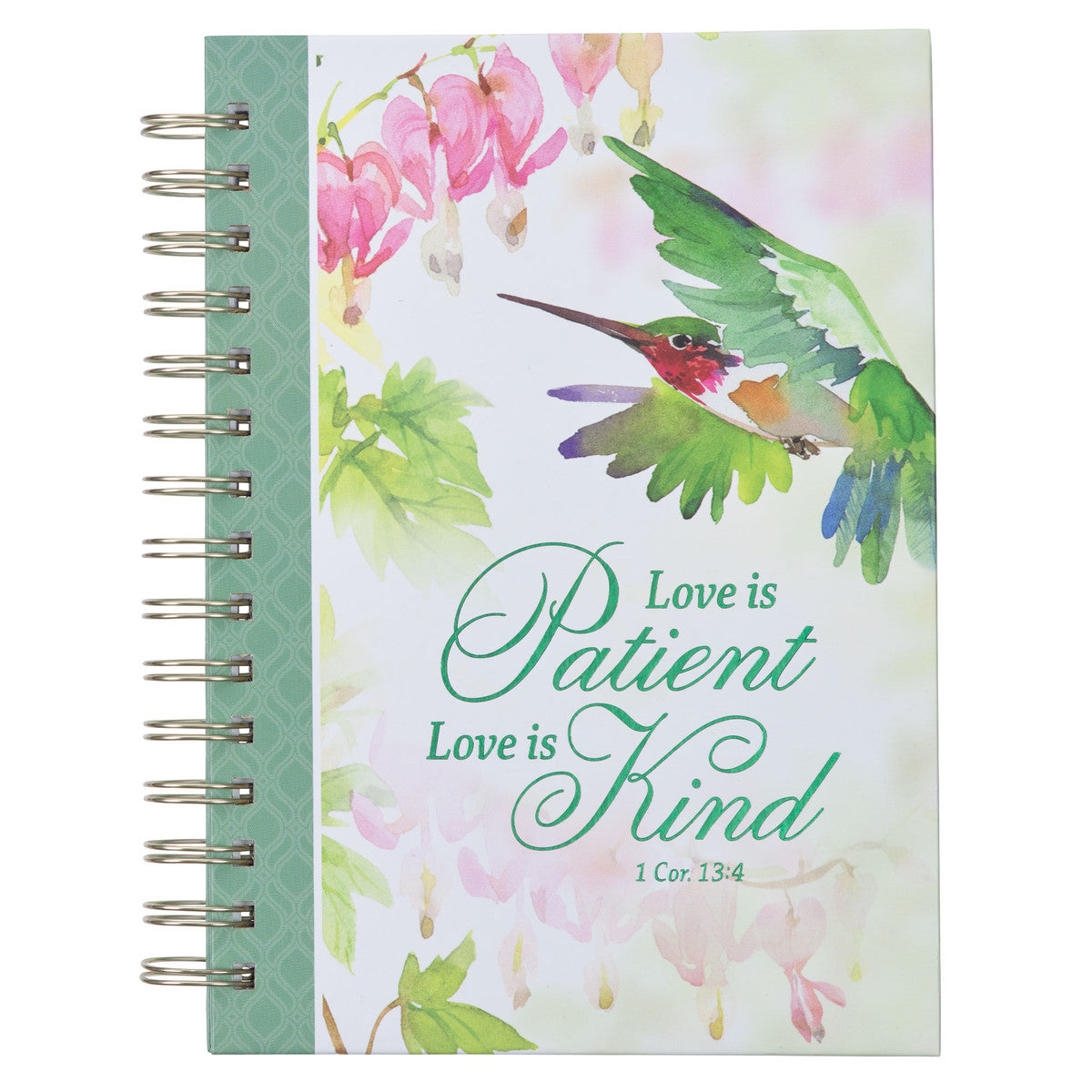 The Love is Patient Green Hummingbird Large Wirebound Journal is part of the Persevere Hummingbird Collection, designed to celebrate wise mothers, grandmothers, godmothers, mentors, and friends. This collection includes ceramic mugs, faux leather bookmarks, a magnet set, faux leather journals, wirebound journals, and a gift bag.
