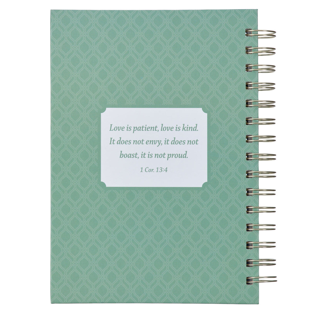 A green band with a tone-on-tone trellis design runs along the gold-toned wire binding and is repeated on the back cover. Also on the back cover is a white frame with a green bracket border that features the entire verse.