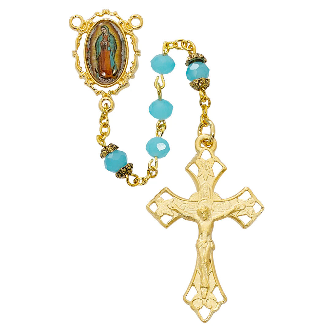 6mm Aqua glass beads with capped Our Father, gold plated pewter crucifix and decal center gift boxed
