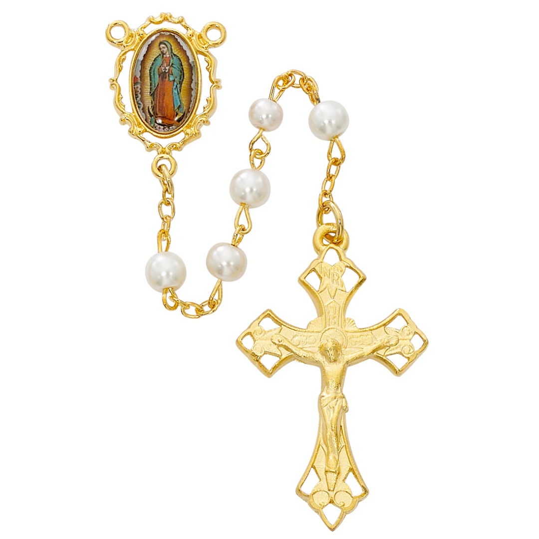 7mm pearl like glass beads with gold plated pewter crucifix and Guadalupe decal center. Gift boxed.