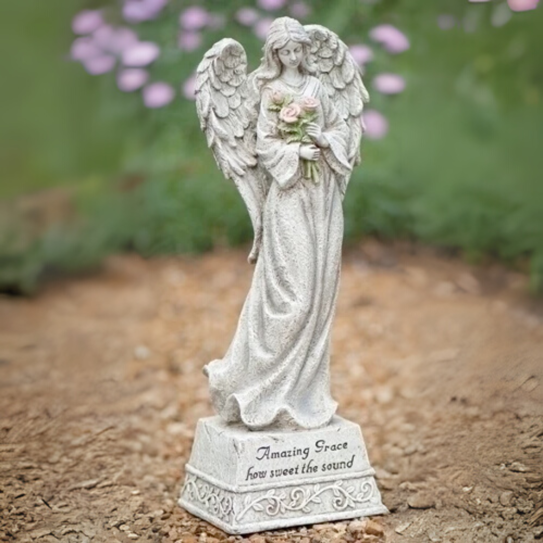 Memorial garden statue of an angel cradling flowers, standing on a pedestal, captioned, "Amazing grace, how sweet the sound"