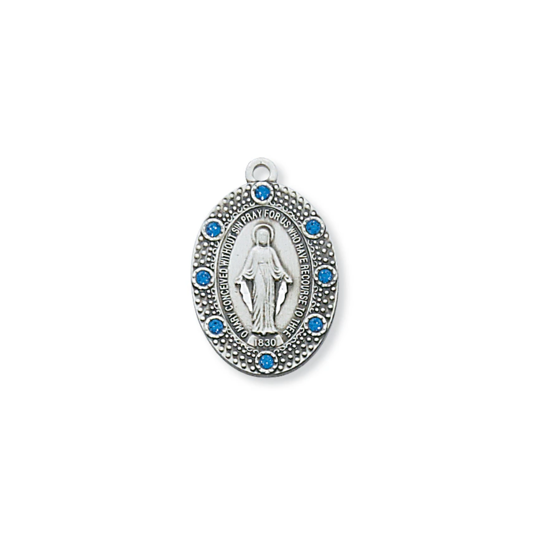 Sterling Silver Miraculous with Blue Glass Stones and 18 in Rhodium Plated Brass Chain and Deluxe Gift Box