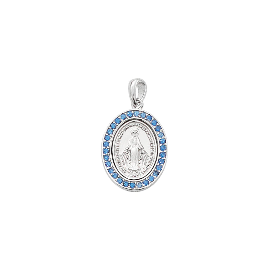 Sterling Silver Miraculous with Blue Glass Stones and 18 in Rhodium Plated Brass Chain and Deluxe Gift Box