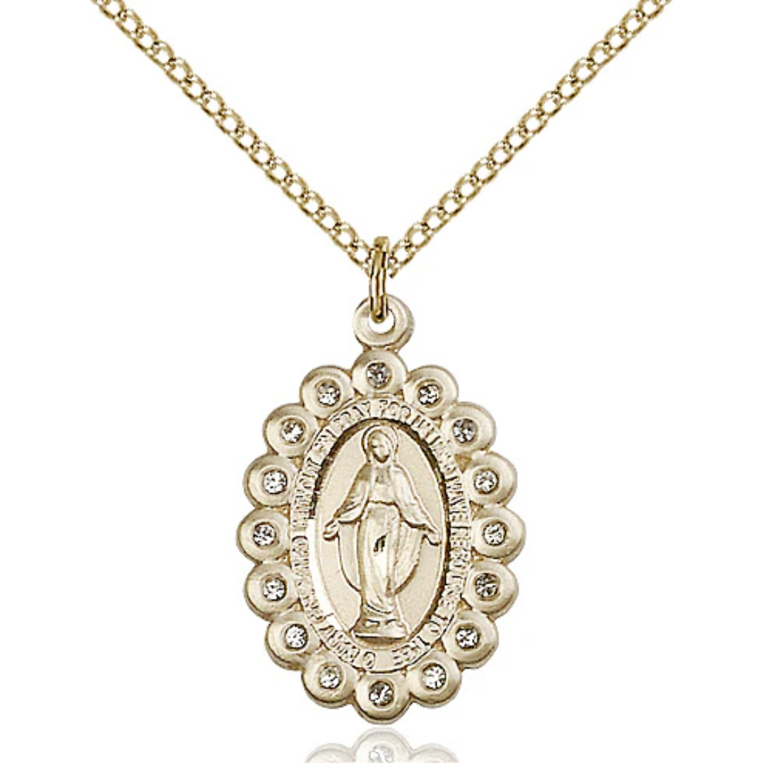 7/8 x 5/8 14kt Gold Filled Miraculous Pendant with April Crystal on 18 inch Gold Filled Light Curb Chain