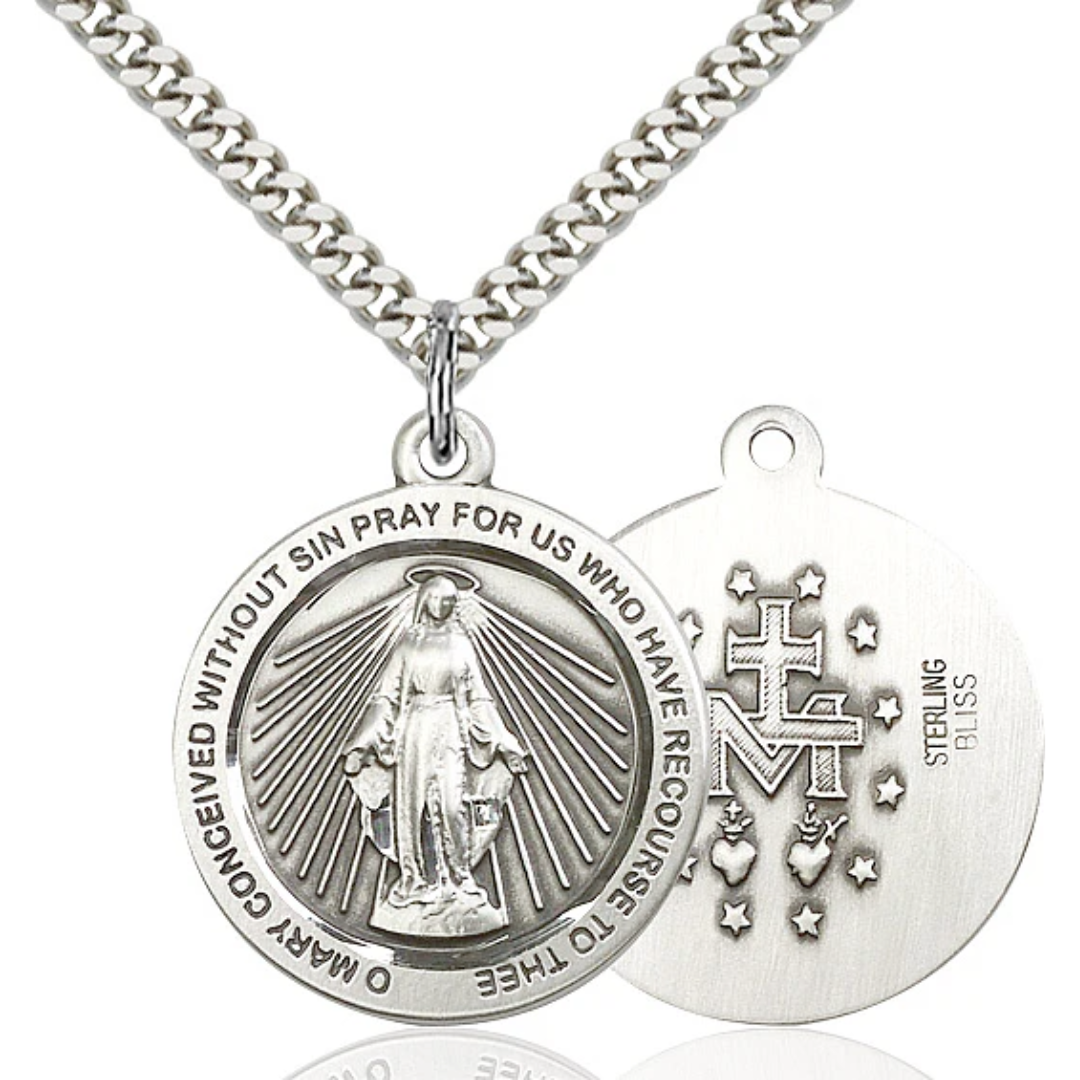 1 x 7/8 Sterling Silver Miraculous Pendant on 24 Inch Light Rhodium Heavy Curb Chain