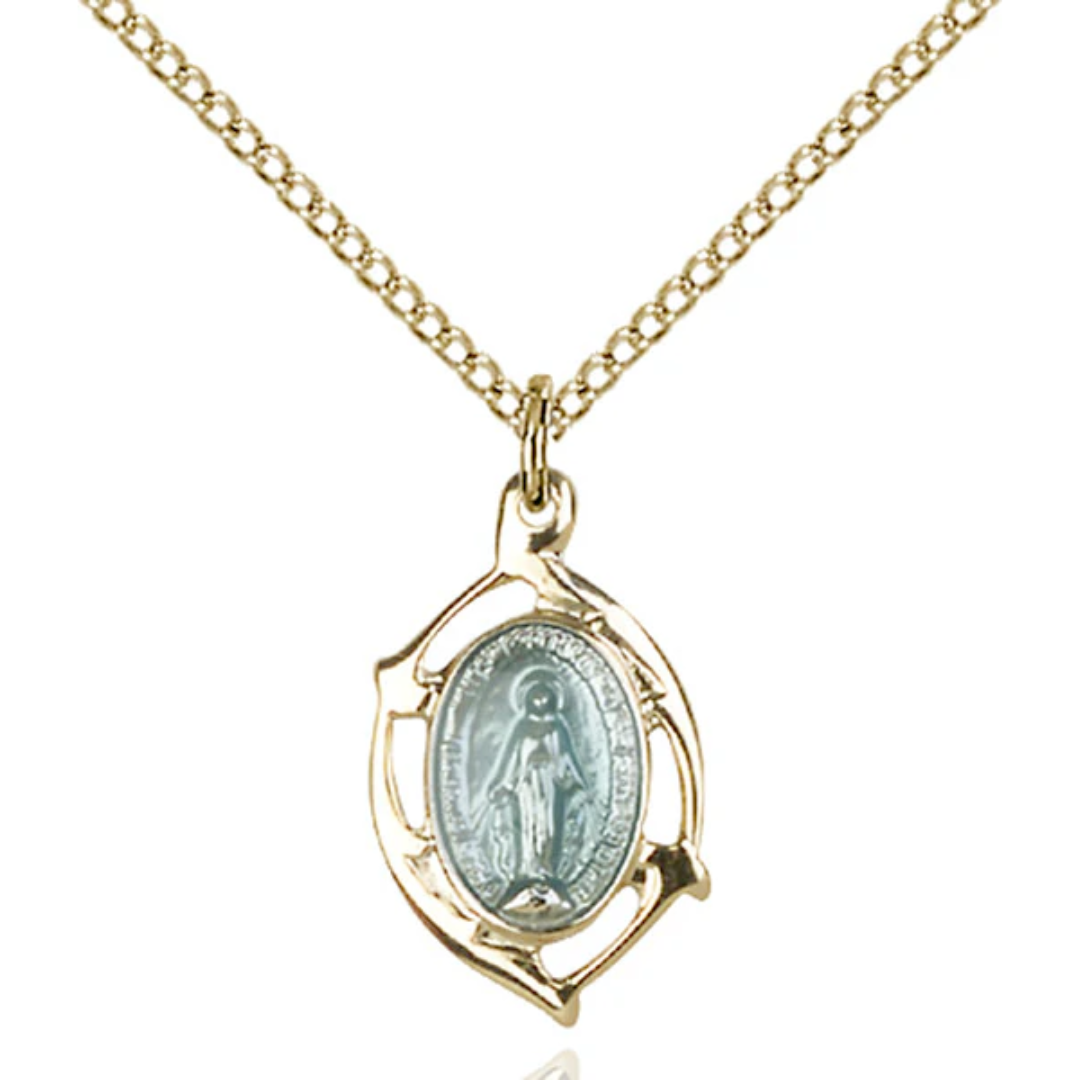 5/8 x 3/8 Gold Plated Sterling Silver Miraculous Pendant on 18 inch Gold Filled Light Curb Chain with Blue Epoxy