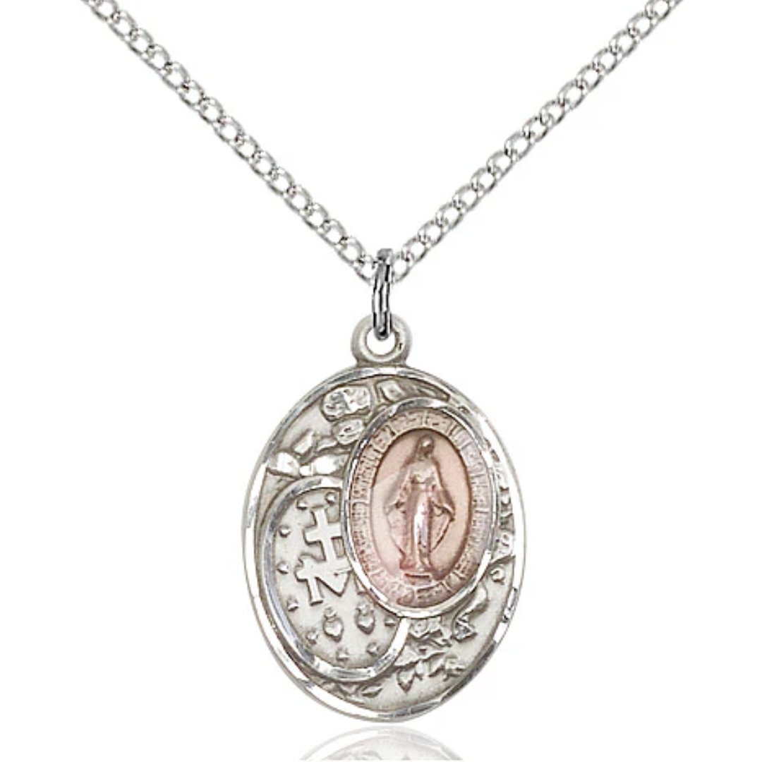 3/4 x 1/2 Sterling Silver Miraculous Pendant on 18 inch Sterling Silver Light Curb Chain with Pink Enamel