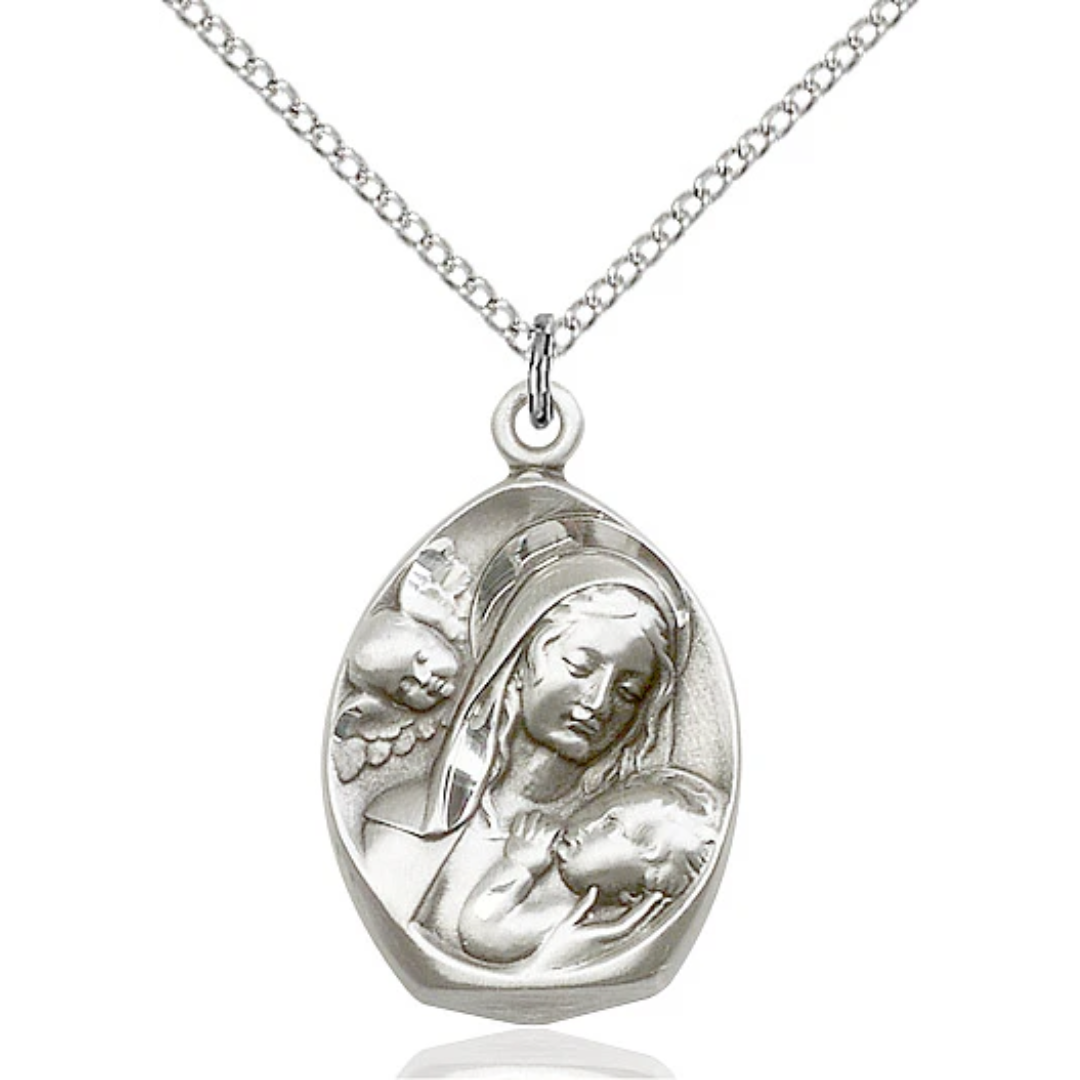 1 x 5/8 Sterling Silver Madonna & Child Pendant on 18 inch Sterling Silver Light Curb Chain