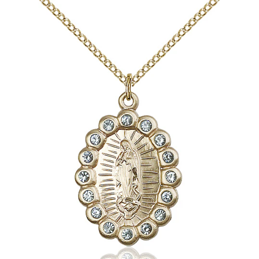 1 x 5/8 14kt Gold Filled O/L of Guadalupe Pendant with March Aqua on 18 inch Gold Filled Light Curb Chain