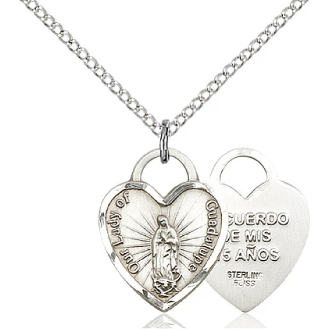 5/8 X 1/2 Sterling Silver O/L of Guadalupe Heart Pendant on 18 inch Sterling Silver Light Curb Chain