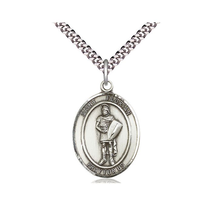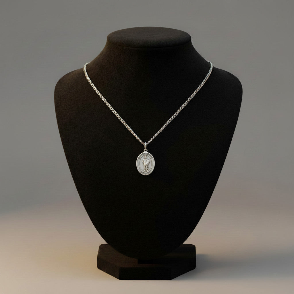Crafted in genuine sterling silver, this St. Florian medal necklace is a timeless expression of faith and protection. The finely detailed 1-inch medal bears the image of St. Florian, the beloved Patron Saint of Fire Fighters, and hangs from a substantial 24-inch rhodium-plated heavy curb chain that resists tarnish and holds its luster for years. Whether worn daily or gifted for a special occasion, this piece carries both spiritual meaning and enduring quality.