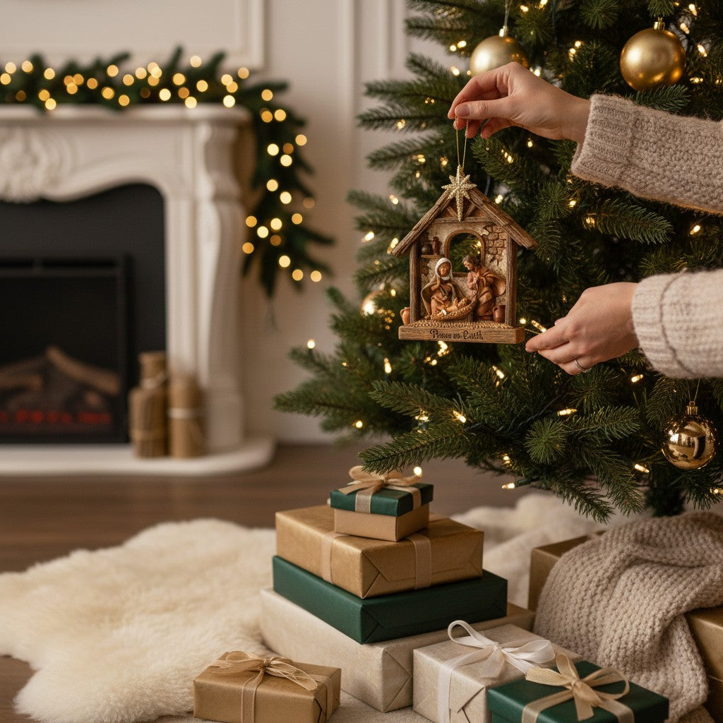 This ornament captures the quiet beauty of the Holy Family in a rustic stable, with Mary and Joseph watching tenderly over the Christ Child in the manger. Above the roof, a glittering star shines brightly, echoing the hope of Bethlehem, while the words "Peace on Earth" are inscribed below as a heartfelt reminder of the season's message. A meaningful keepsake to celebrate the joy and promise of Christmas.