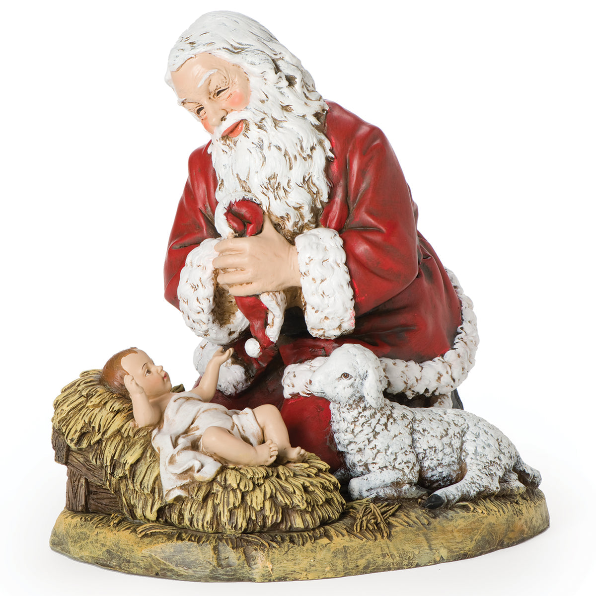 From the Joseph™s Studio Collection, this Kneeling Santa with Lamb figure captures a tender moment of reverence and peace. Santa kneels before the Christ Child, holding his hat over his heart as he gazes upon the newborn Savior resting in the manger. Hand-painted with exceptional care from the soft folds of Santa™s robe to the lifelike texture of the straw and lamb it™s a beautiful reminder that Christmas begins at the manger.