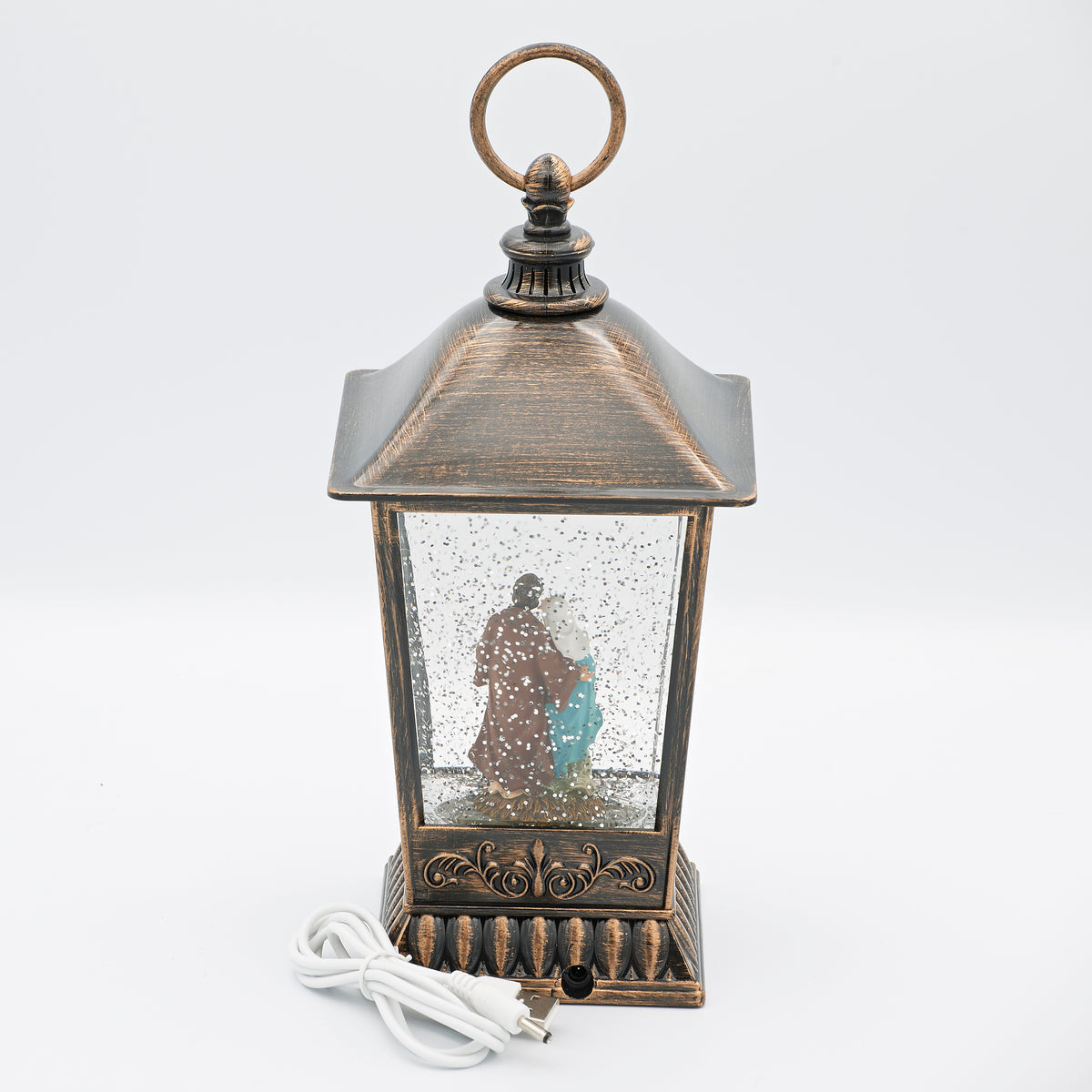 This lighted swirl lantern showcases a standing Holy Family surrounded by gently swirling glitter. A reverent and elegant piece that brings spiritual warmth to your Christmas decor.