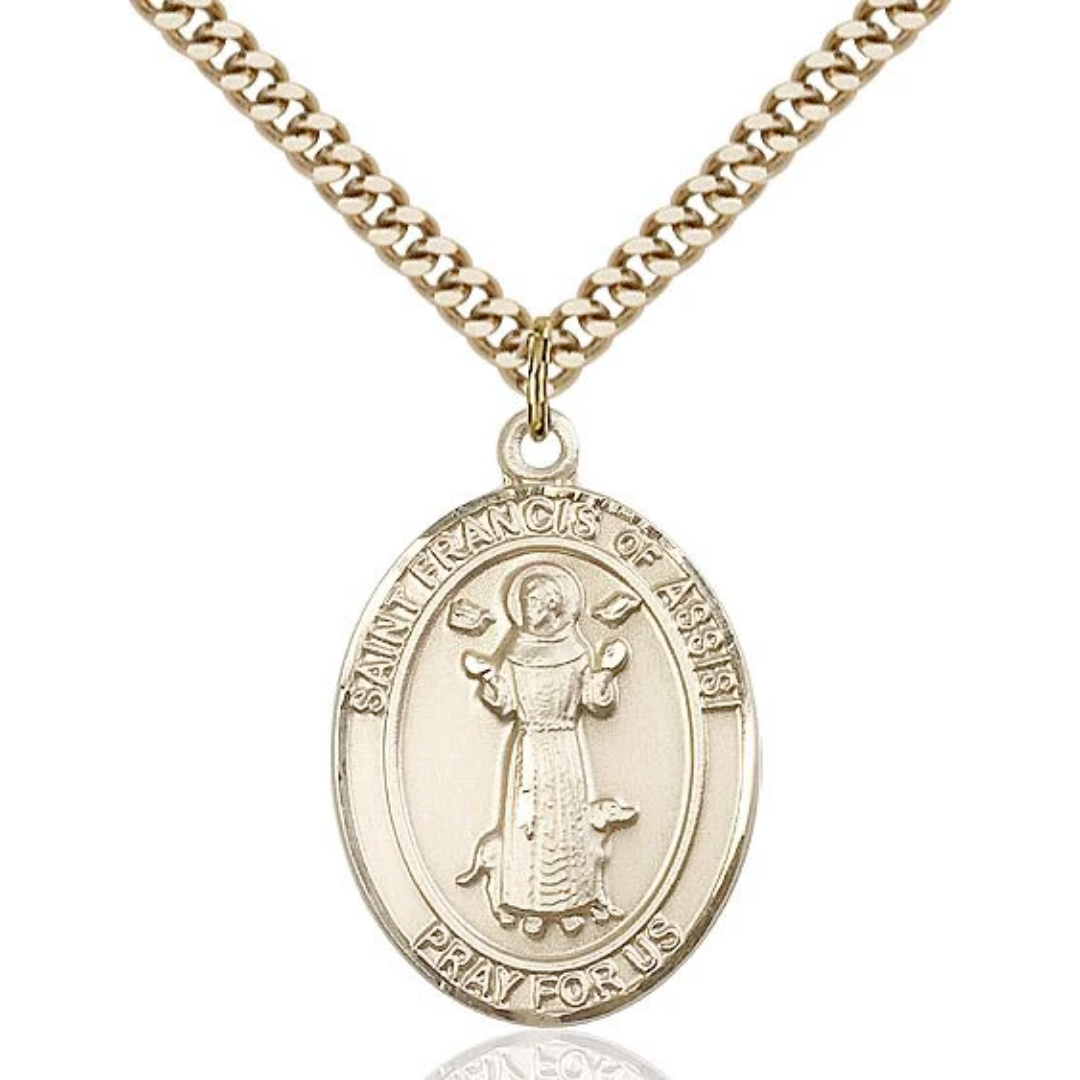 1 x 3/4 14kt Gold Filled St. Francis of Assisi Pendant on 24 inch Gold Plate Heavy Curb Chain