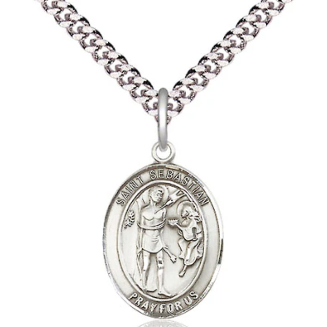 Sterling Silver St Sebastian Pendant on a 24 inch Light Rhodium Heavy Curb Chain.