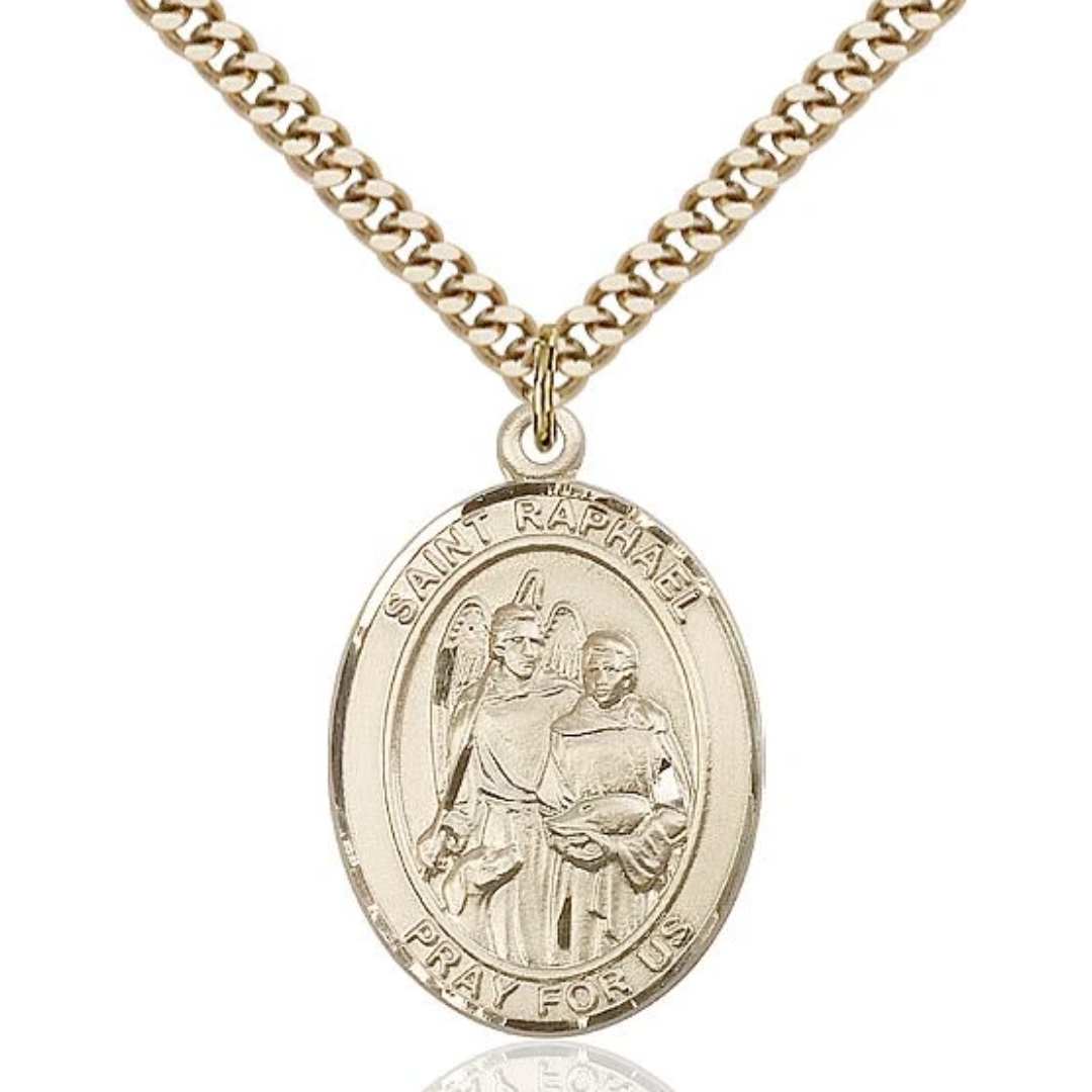 · St. Raphael the Archangel Medal.· Medal Measures 1-inch tall by 3/4-inch wide.· Chain is 24 Inches in length Endless Gold Plate Heavy Curb Chain.· St. Raphael the Archangel is the Patron Saint of Blind/Love/Safe Journey.