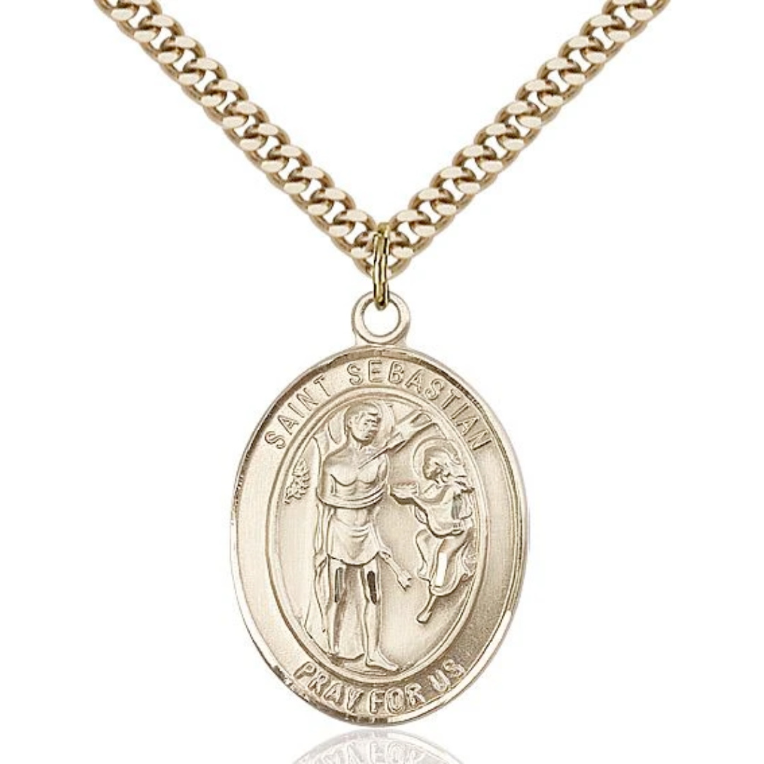 · St. Sebastian Medal.· Medal Measures 1-inch tall by 3/4-inch wide.· Chain is 24 Inches in length Endless Gold Plate Heavy Curb Chain.· St. Sebastian is the Patron Saint of Athletes/Soldiers.