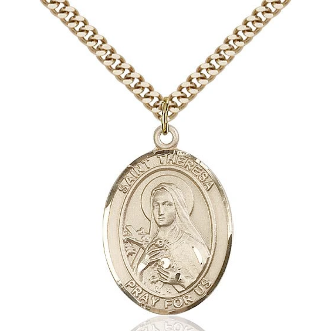 · St. Theresa Medal.· Medal Measures 1-inch tall by 3/4-inch wide.· Chain is 24 Inches in length Endless Gold Plate Heavy Curb Chain.· St. Theresa is the Patron Saint of Foreign Missions.