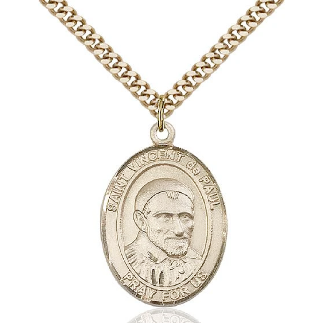 · St. Vincent de Paul Medal.· Medal Measures 1-inch tall by 3/4-inch wide.· Chain is 24 Inches in length Endless Gold Plate Heavy Curb Chain.· St. Vincent de Paul is the Patron Saint of Charities/Caregivers.